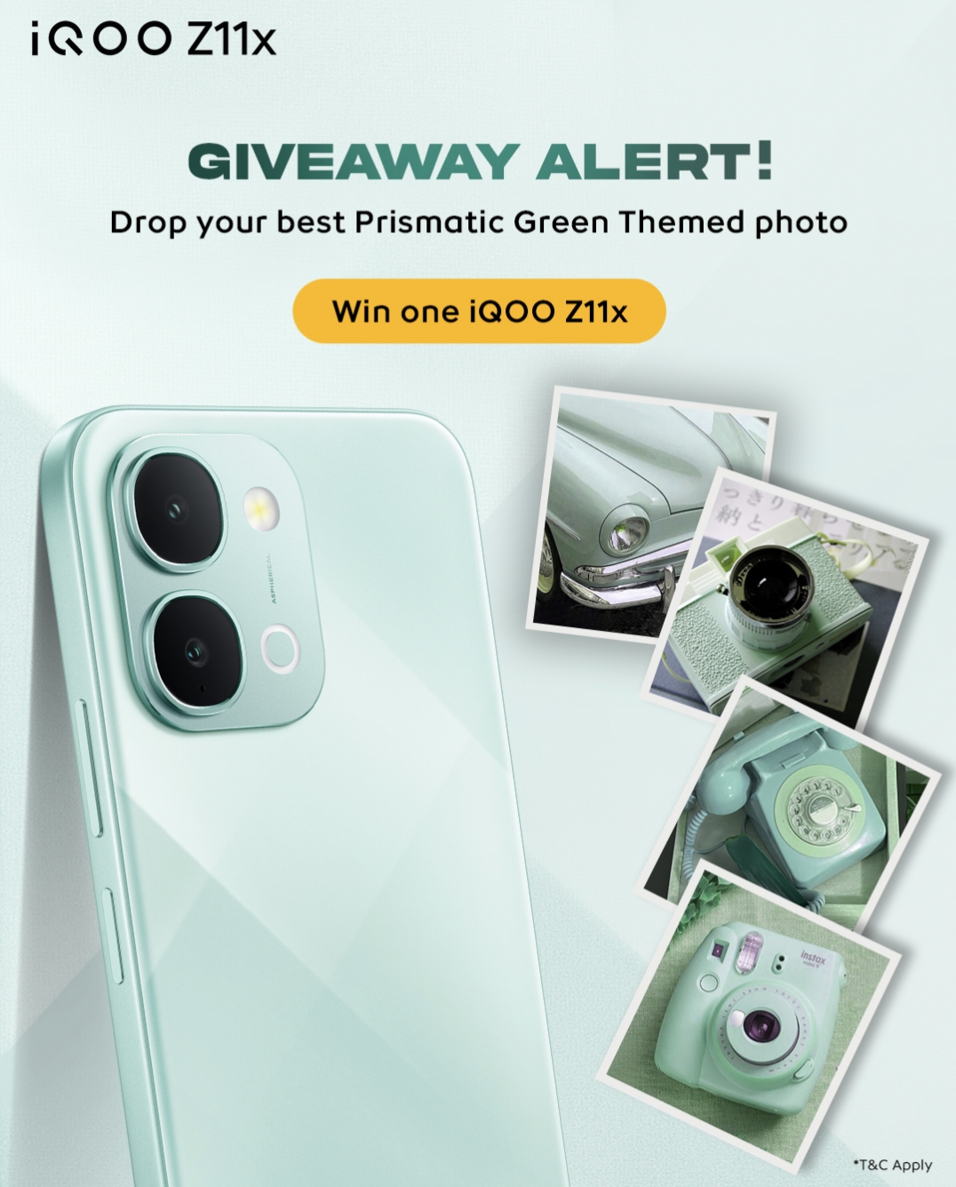 We are thrilled to announce an exciting GIVEAWAY where you stand a chance to win brand new iQOO Z11x Smartphone! All you have to drop your best Prismatic Green Themed Photo and tag 5 Friends.