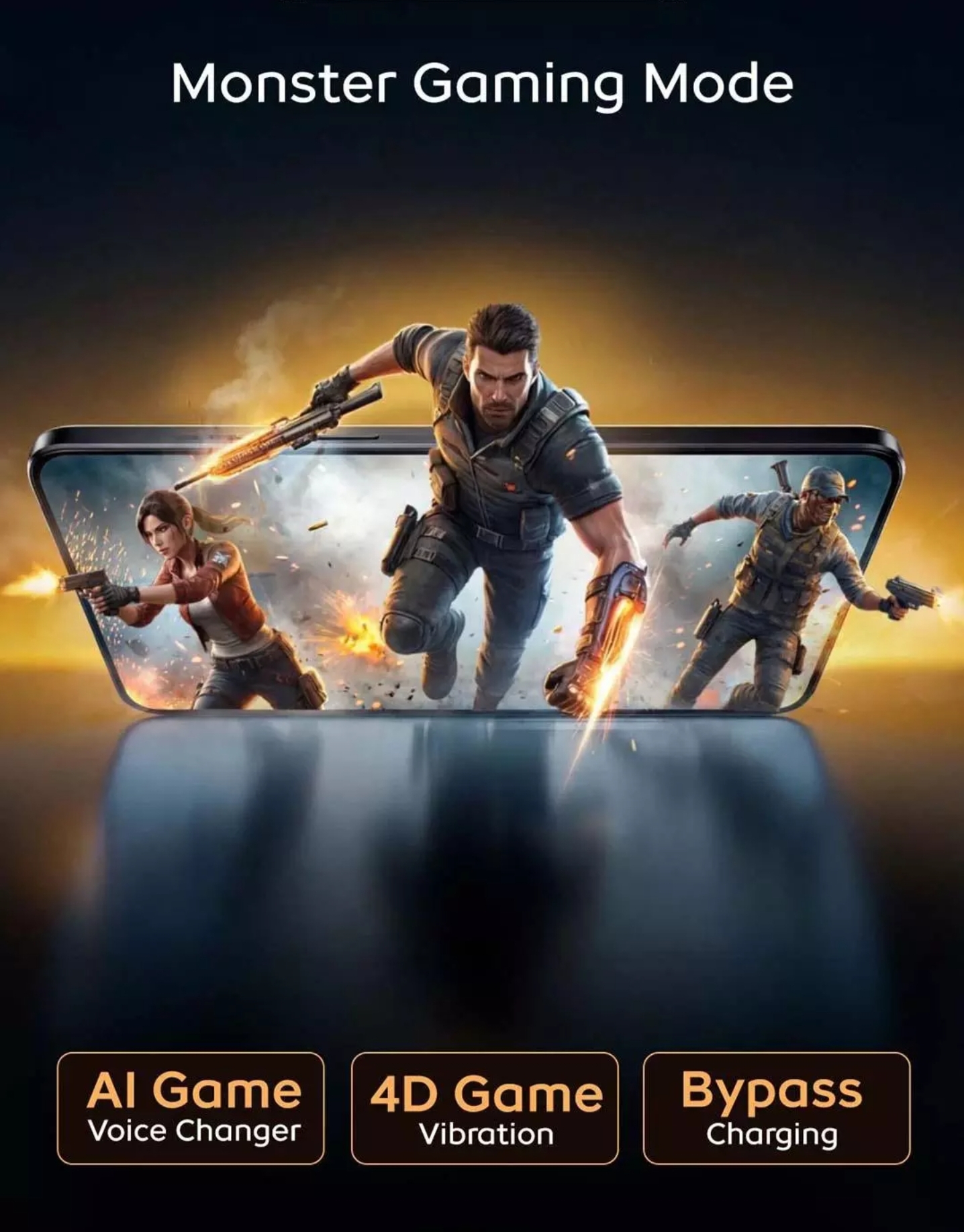 the phone introduces Monster Gaming Mode, featuring AI Voice Changer, 4D Game Vibration, and bypass charging,