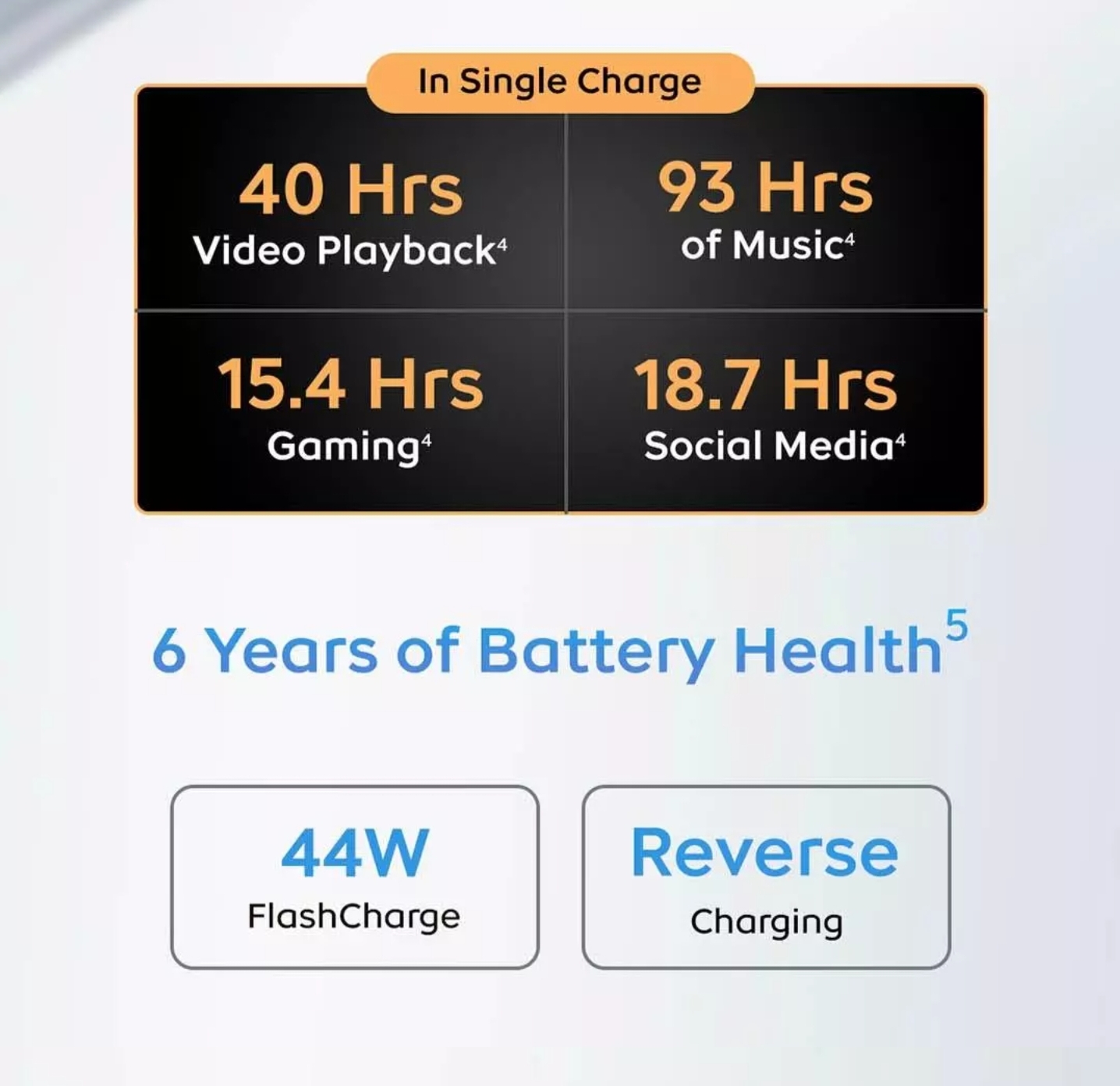The iQOO Z11x packs a massive 7300mAh battery, making it one of the biggest batteries in its segment. With this capacity, users can enjoy up to 40 hours of video playback, 93 hours of music playback, 15.5 hours of gaming, and around 18.7 hours of social media usage. iQOO also claims that the battery is designed to last up to six years, ensuring long-term durability.