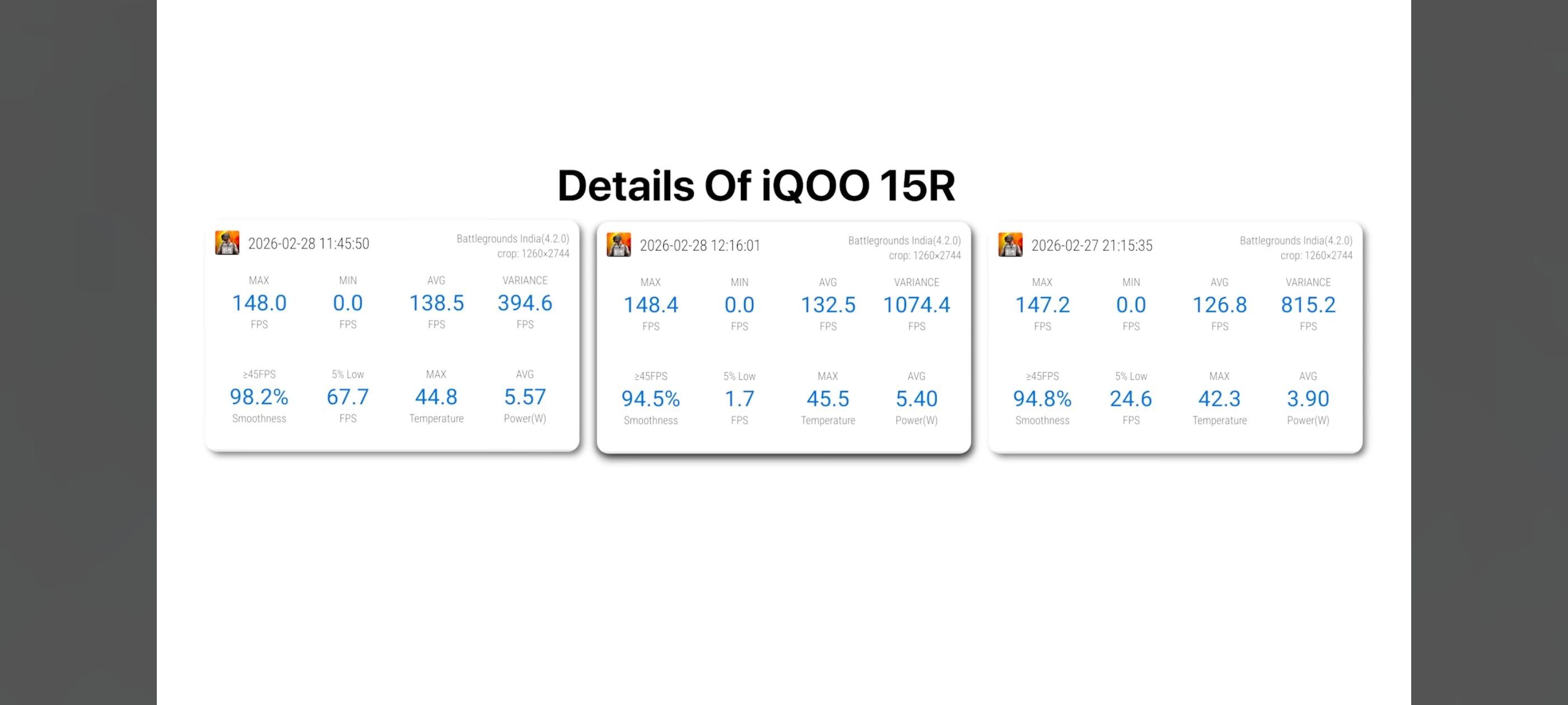 Also dropping a quick note about the FPS screenshots from the video 😅. The first screenshot of OnePlus 15R shows around 161 avg FPS (without screen recording), which looks great. But the next two screenshots with screen recording ON show the avg FPS dropping noticeably 🤣. Meanwhile, iQOO 15R was still holding close to its high FPS target even with recording running. Recording gameplay adds extra load on the GPU/CPU, so some drop is expected but it’s kinda funny seeing how big the difference looked in those screenshots. Just sharing this here so the team can also see how performance behaves under recording + gaming together....!!!