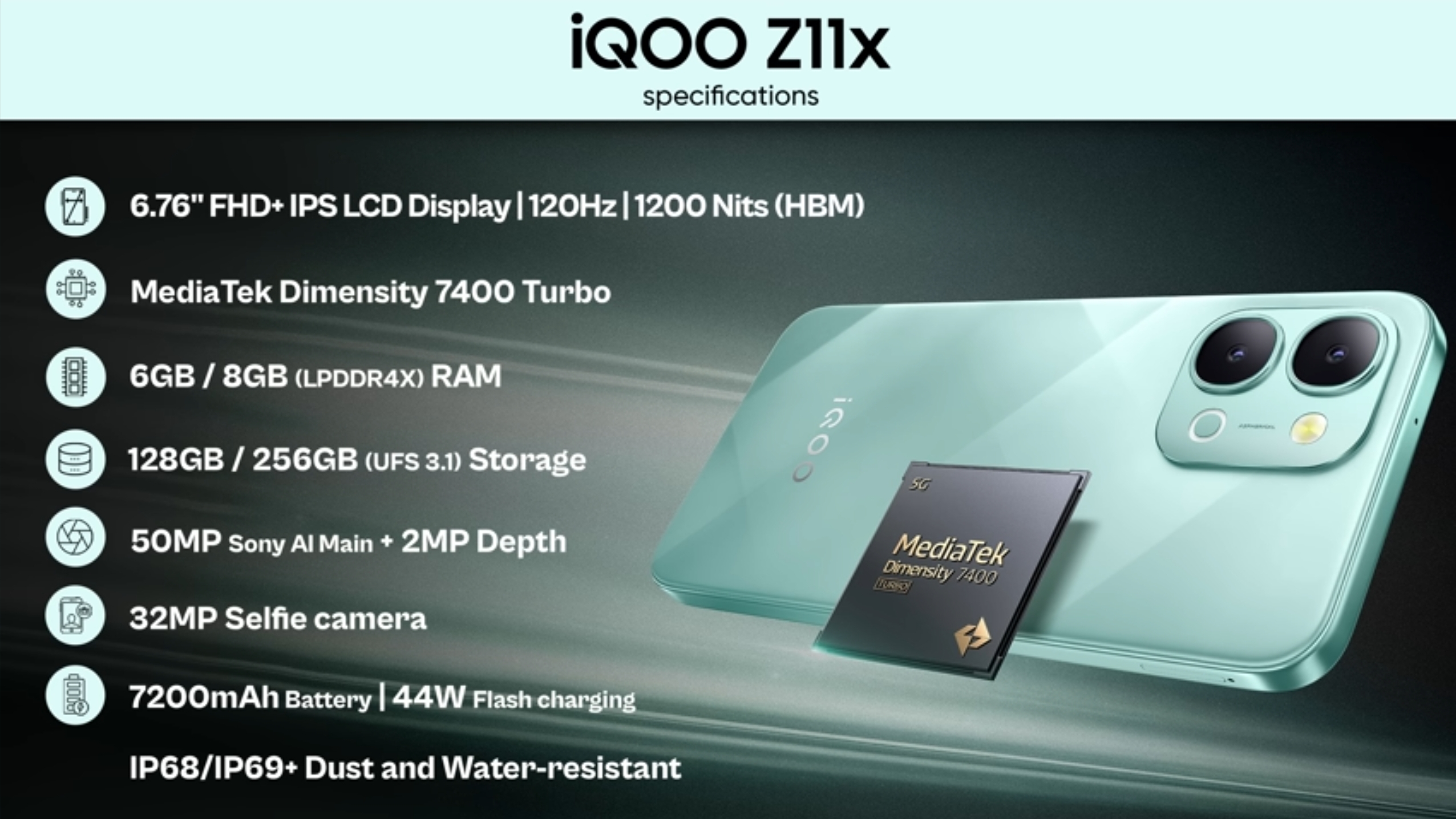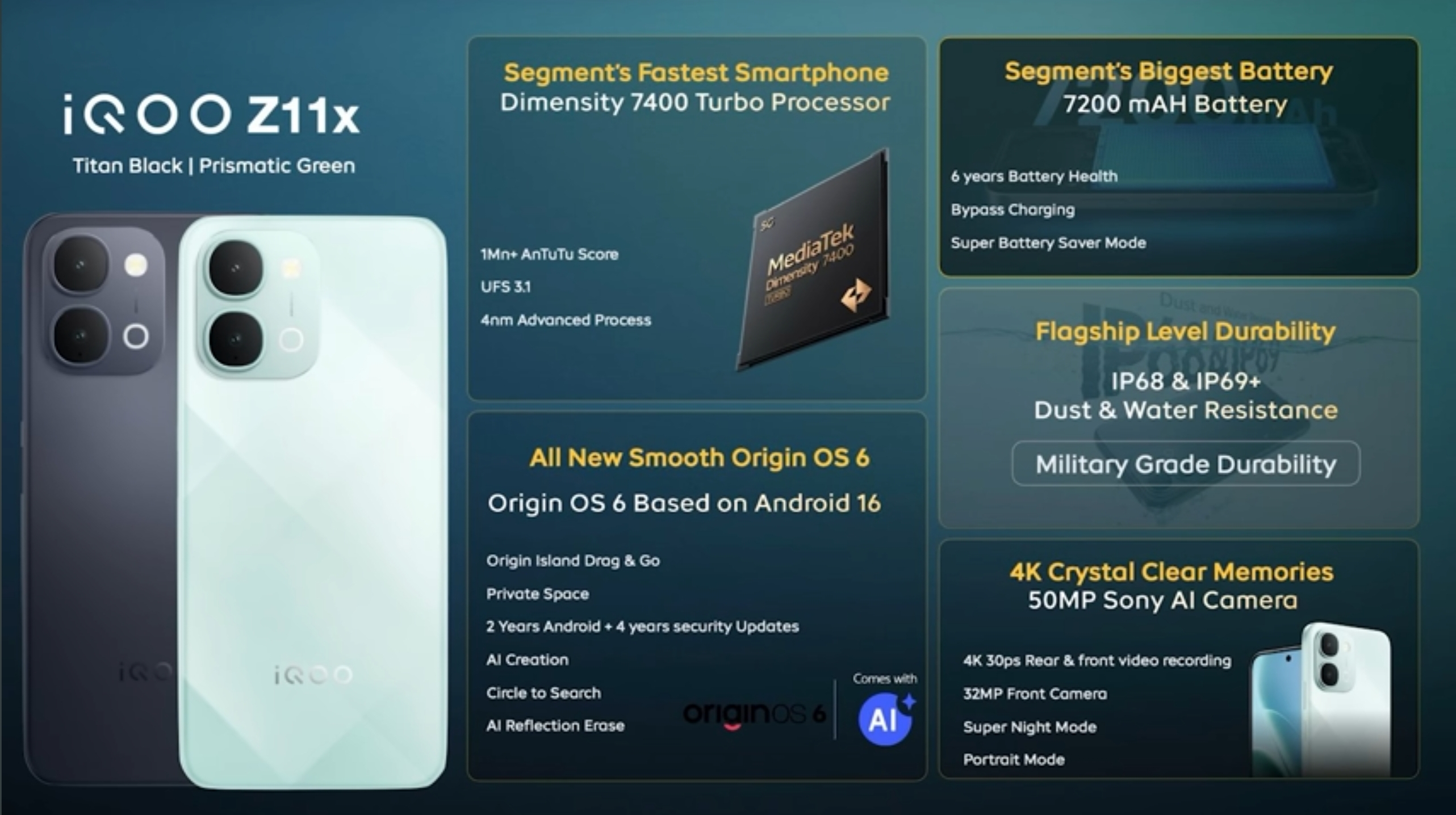 MediaTek Dimensity 7400 turbo processor supports 5G for both slots with 1Mn+ AnTuTu score (Segments fastest smartphone*) a upgrade from previous version Dimensity 7300.