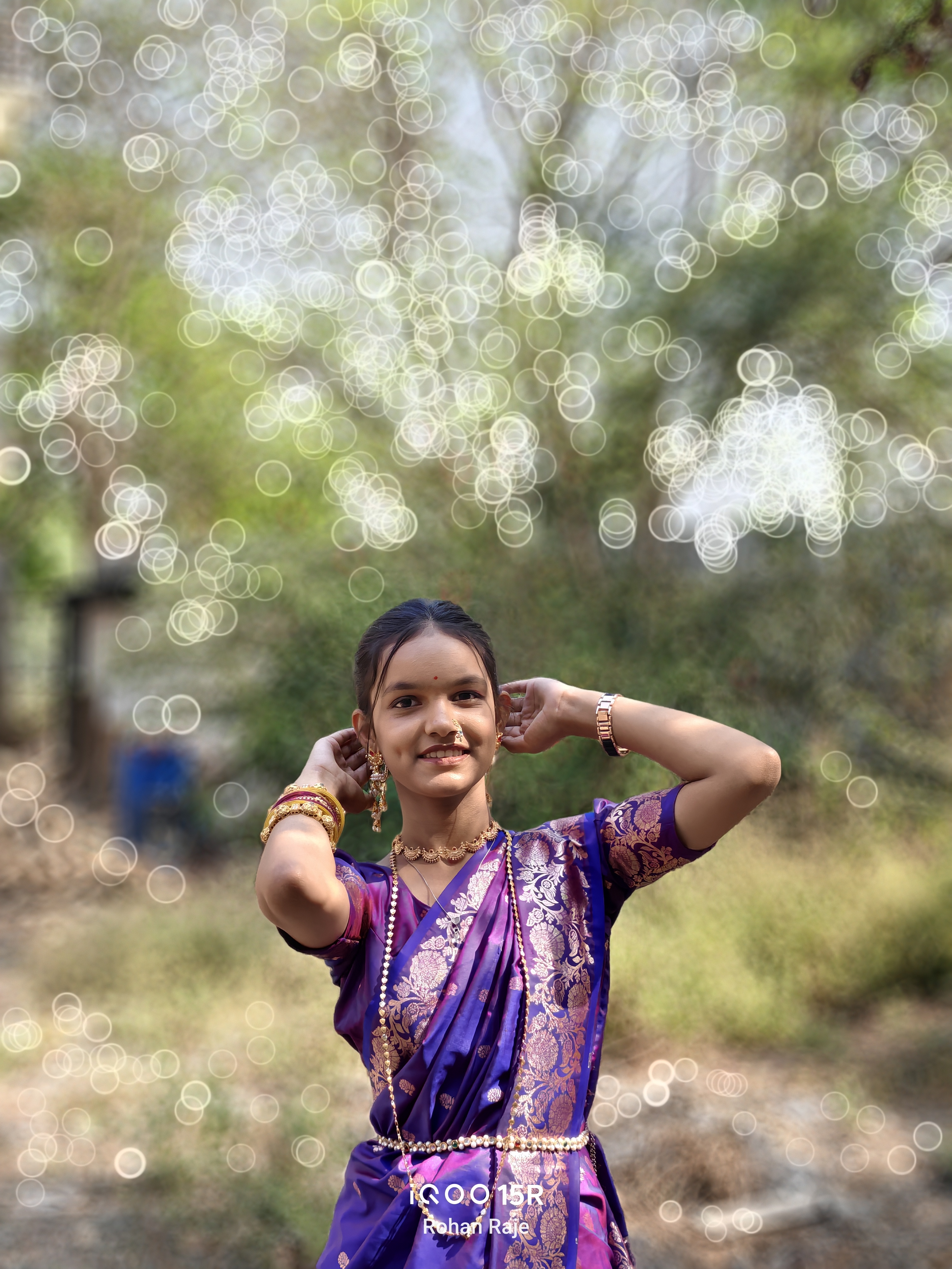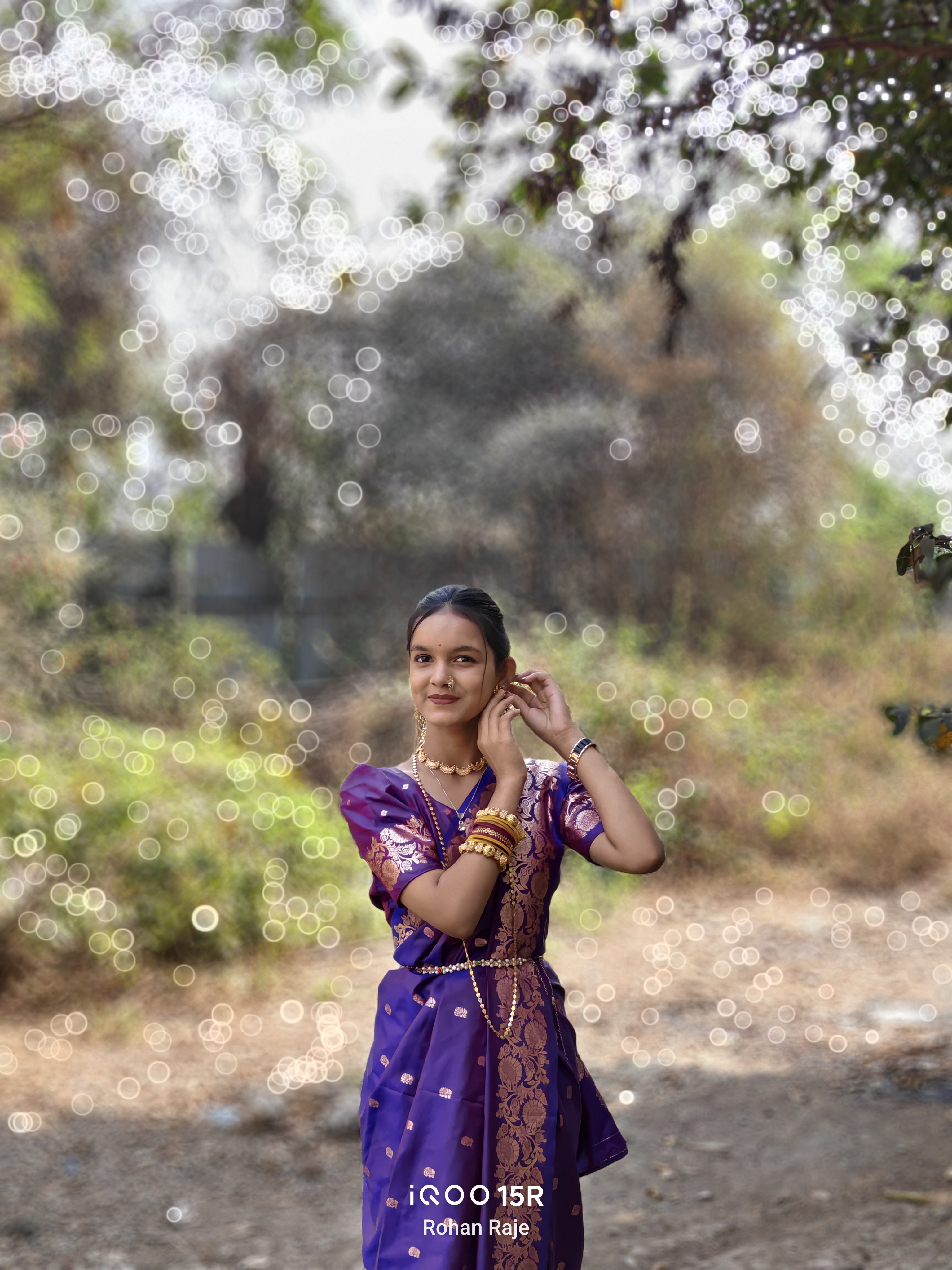 Skin tones appear natural with a slightly warm tone, which actually makes portraits look lively. In the daylight traditional portrait shots, the purple saree and gold embroidery look vibrant and detailed. The colors are rich without looking overly saturated, and the camera does a good job balancing highlights from jewelry and bright sunlight.