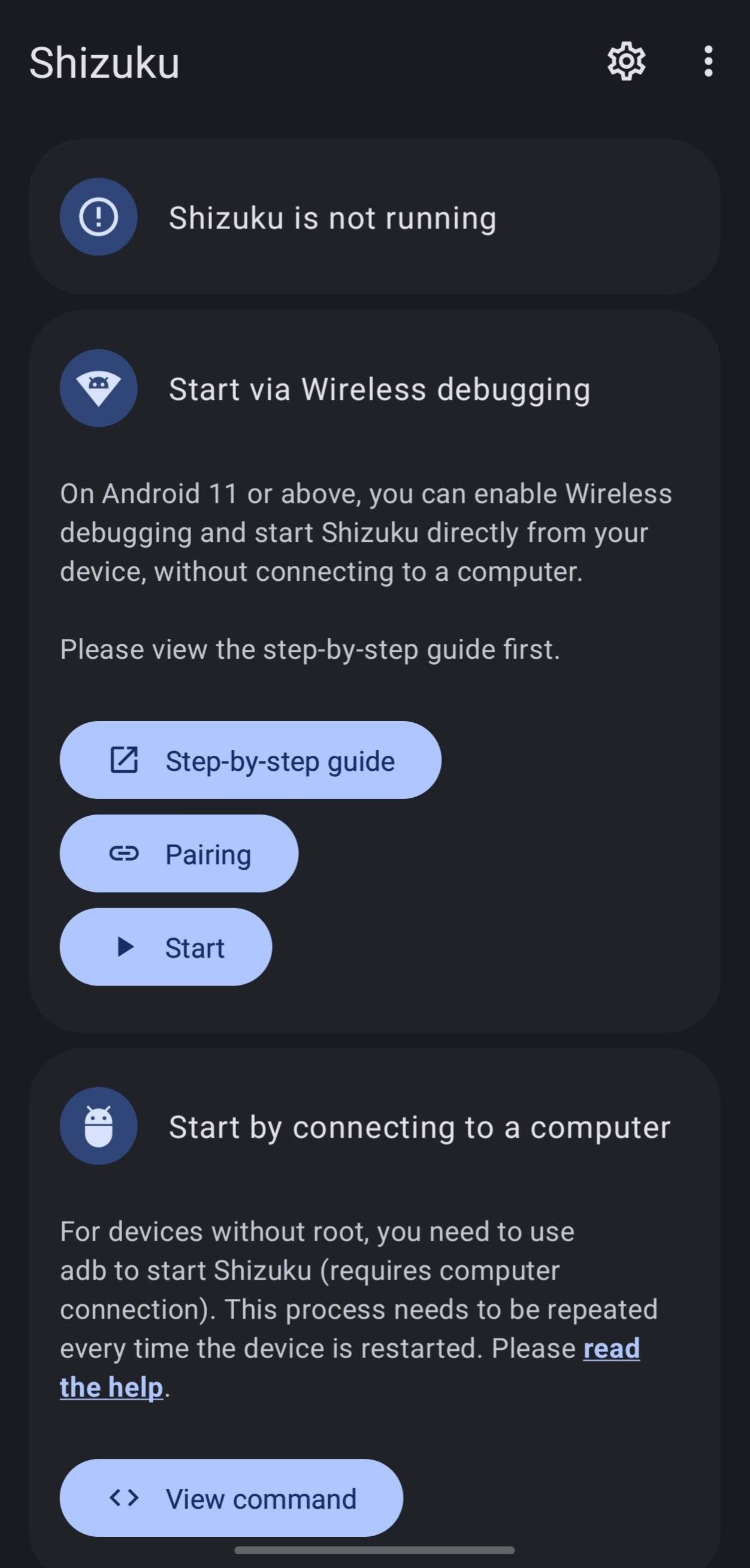 Open the Shizuku app. You will see the message “Shizuku not running.”