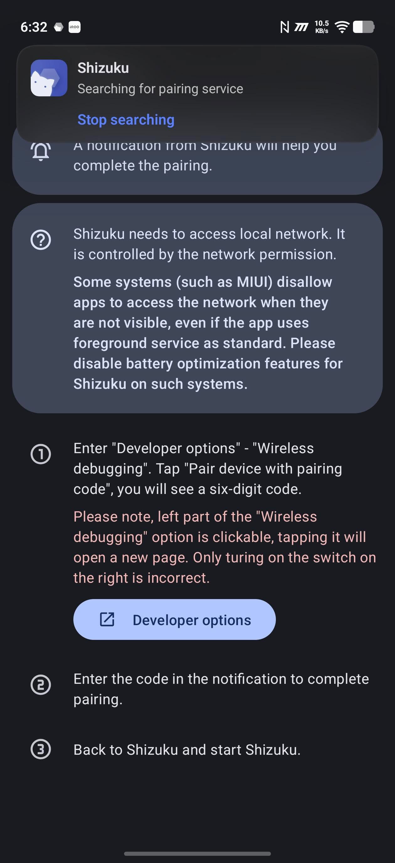 Now open the notification panel. You will see Shizuku searching for pairing device.