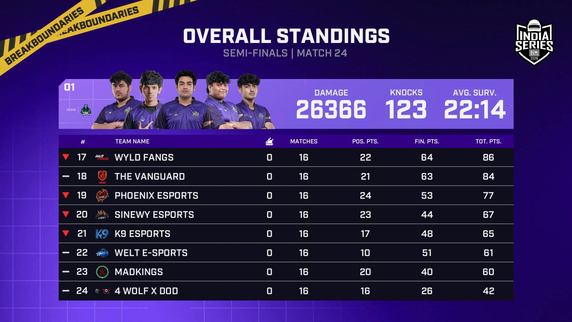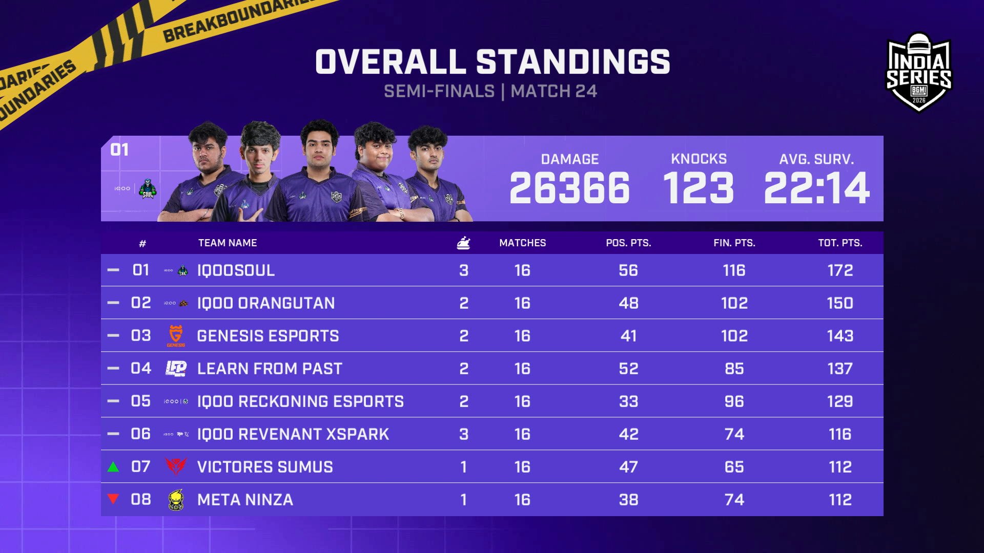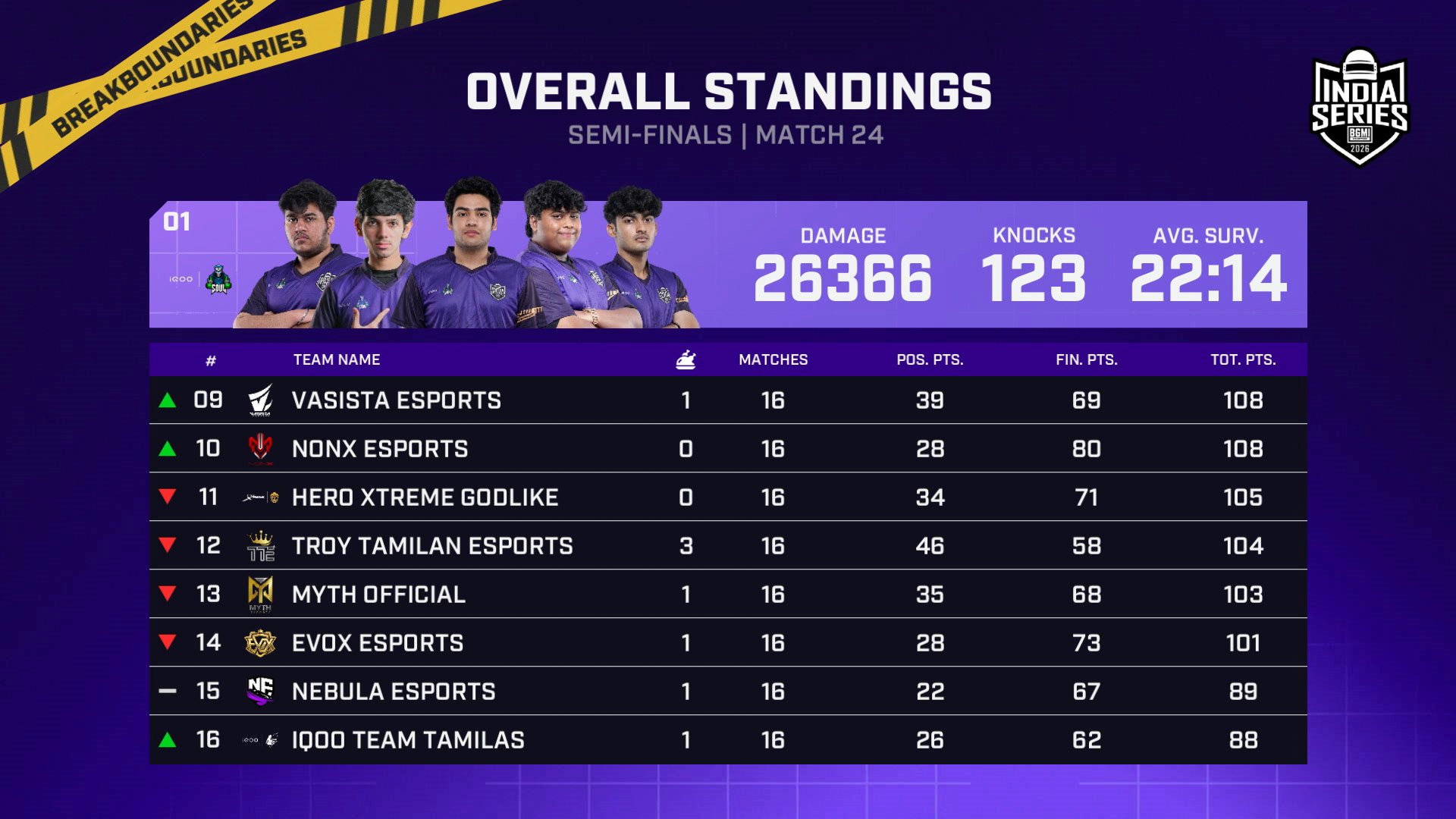 The Semifinals of the Battlegrounds Mobile India Series (BGIS) 2026 came to an end on March 15. The top eight teams from the overall points table have secured their spots in the Grand Finals. Whereas the bottom 16 teams will contest in the Survival stage on March 16 and 17 for the remaining eight spots of the Grand Finals.