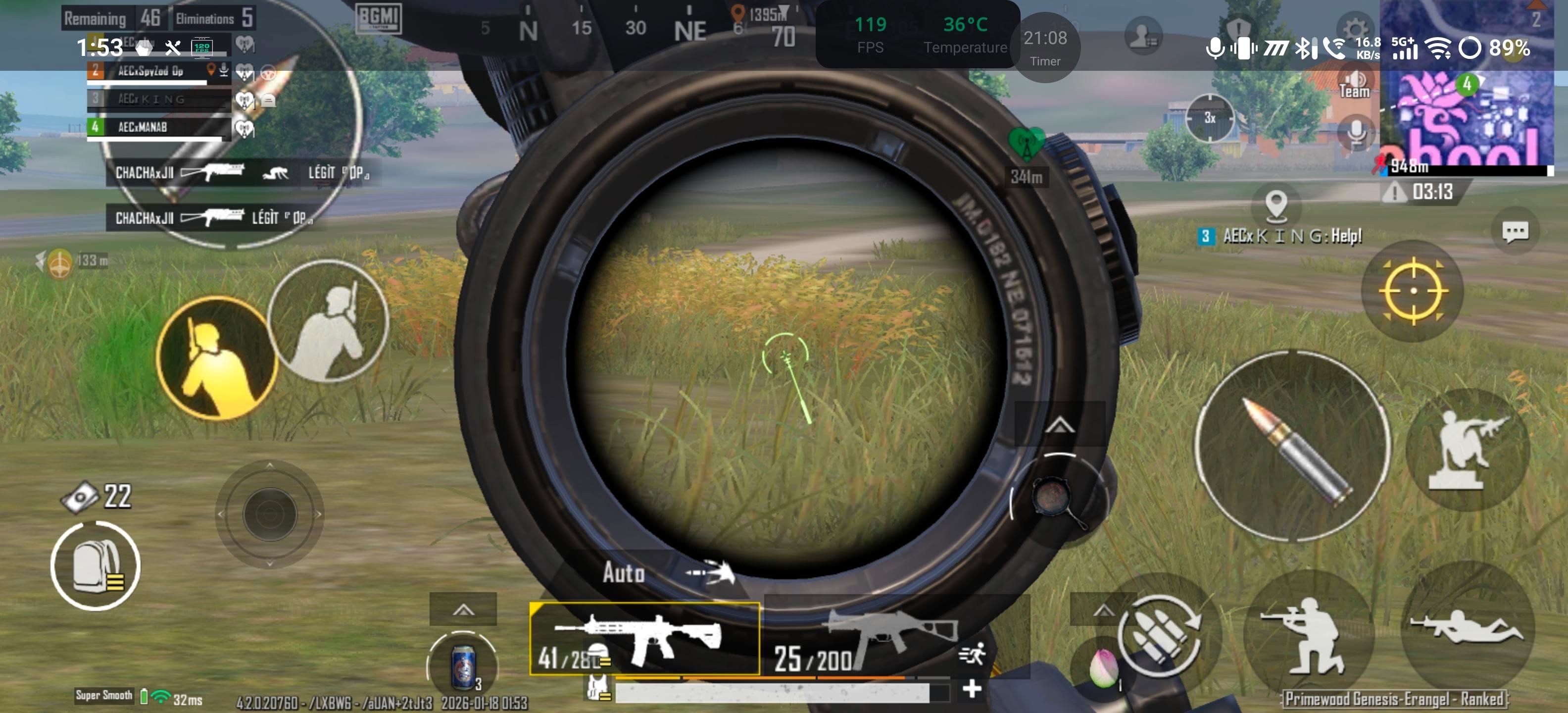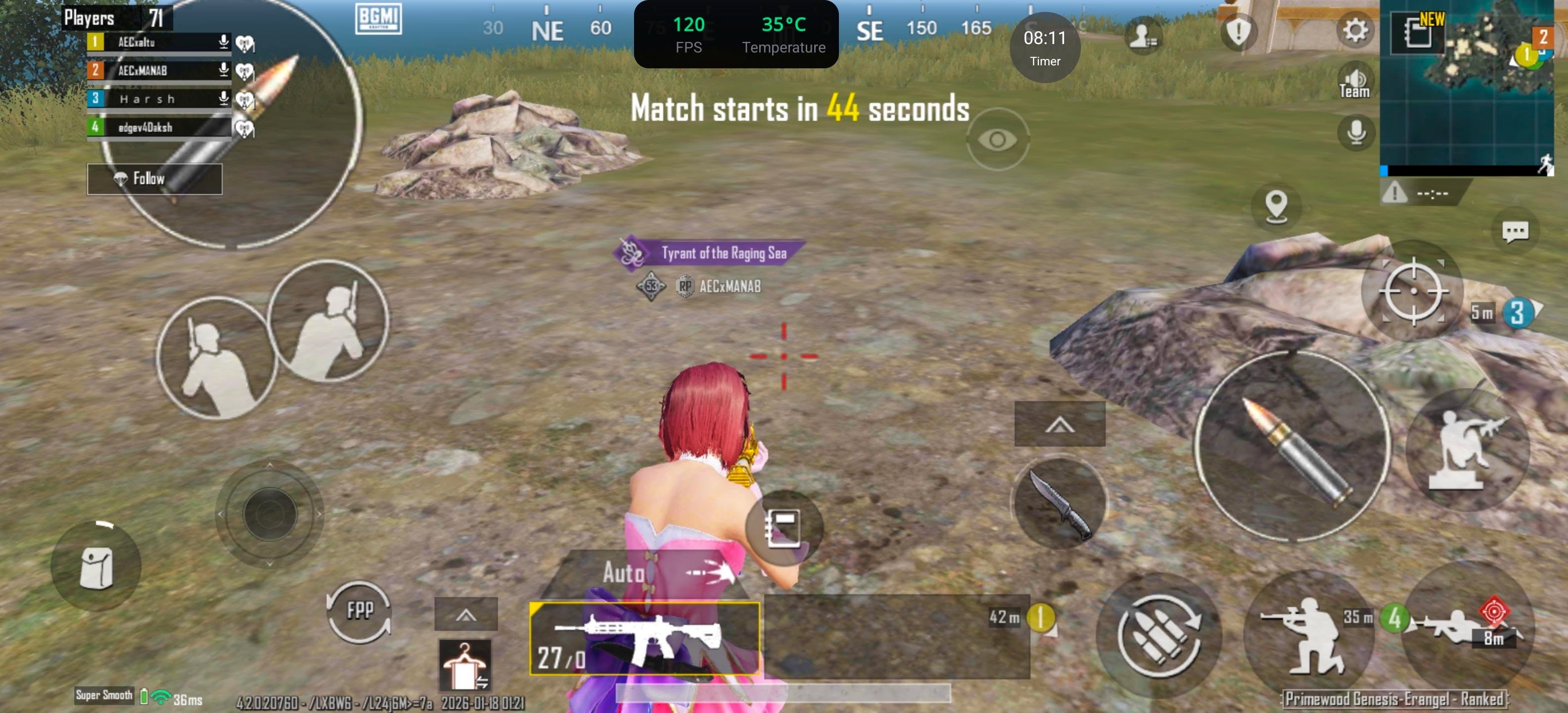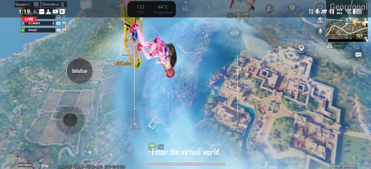 We started the first match on Erangel with my squad, and you can see the FPS meter and device temperature on the top of the screen.