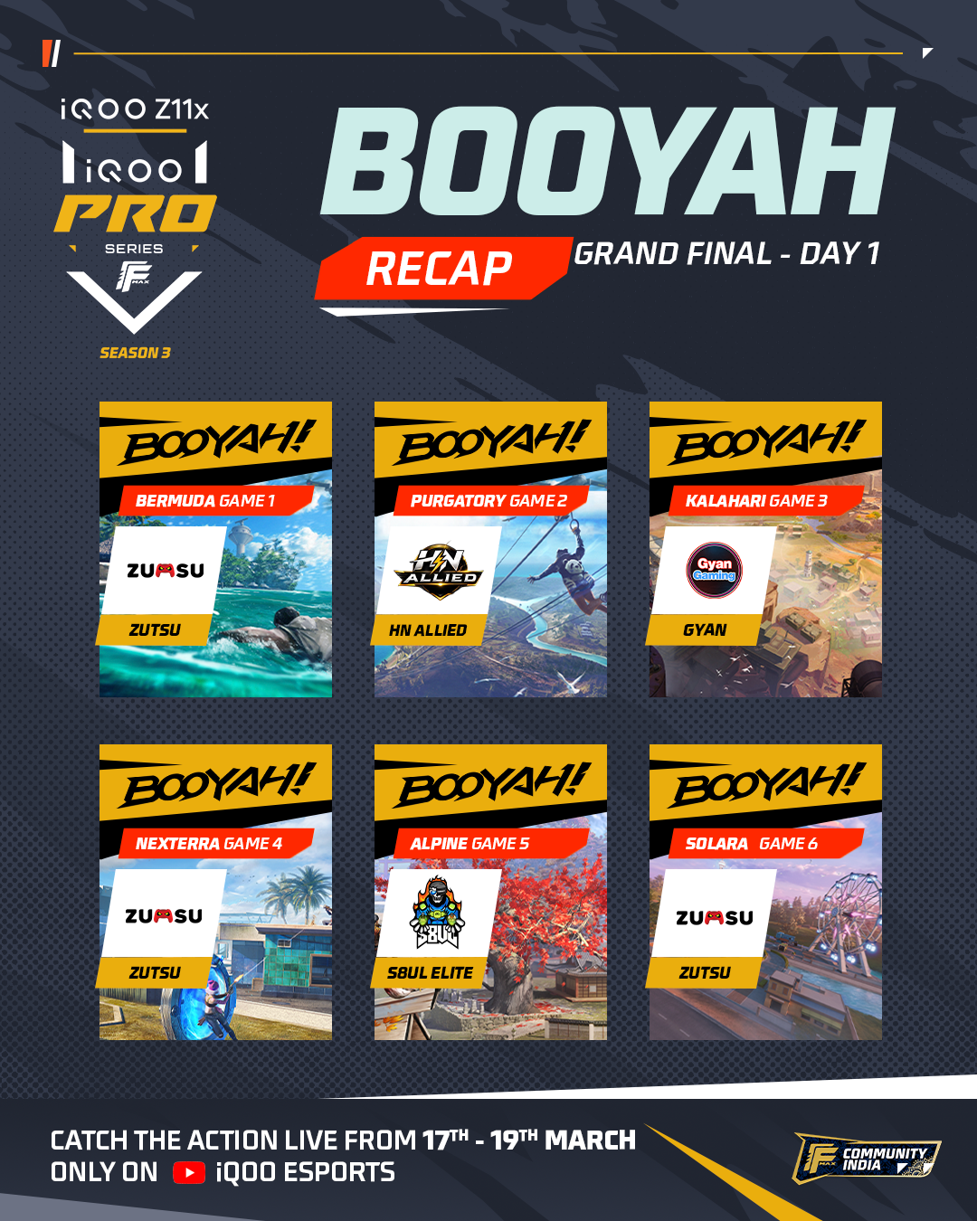A strong showing from Zutsu Gaming with multiple Booyahs, setting the tone for the finals.