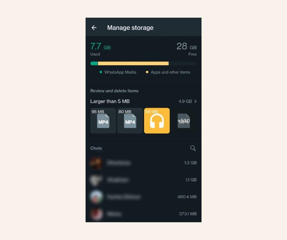 After checking your storage, you can check your media and free up storage space by deleting items that are large or have been downloaded multiple times. You can also remove media based on the chat. To view and delete media: Under Manage Storage, tap "Over 5MB" or select a specific chat. Select and tap one or more media and delete them.