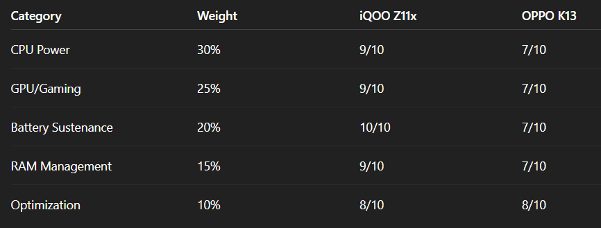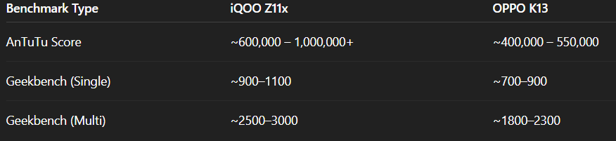 👉 Winner: iQOO Z11x (better CPU optimization)