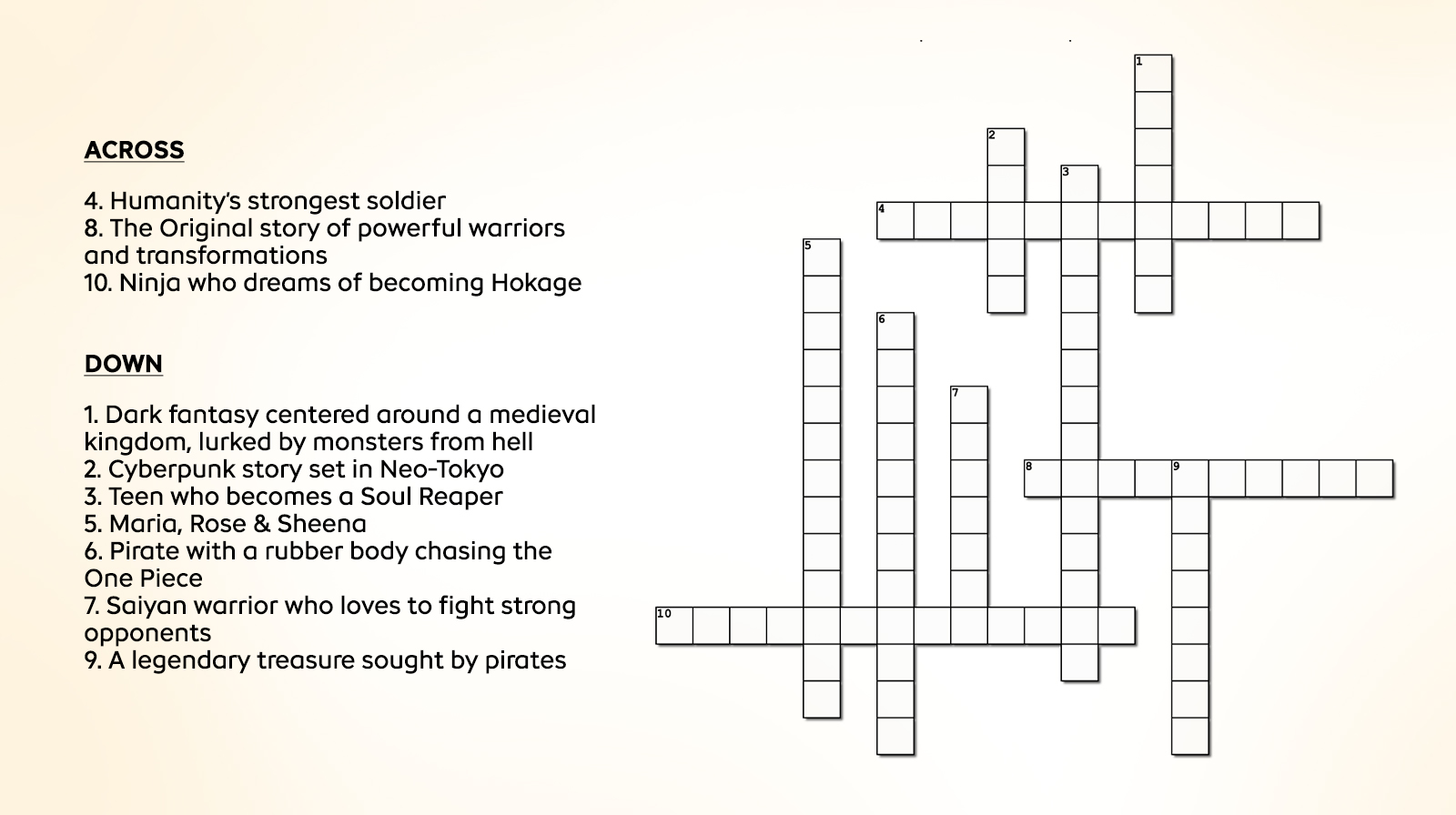 Your task is to solve an anime-themed crossword puzzle featuring 10 popular anime characters and shows.