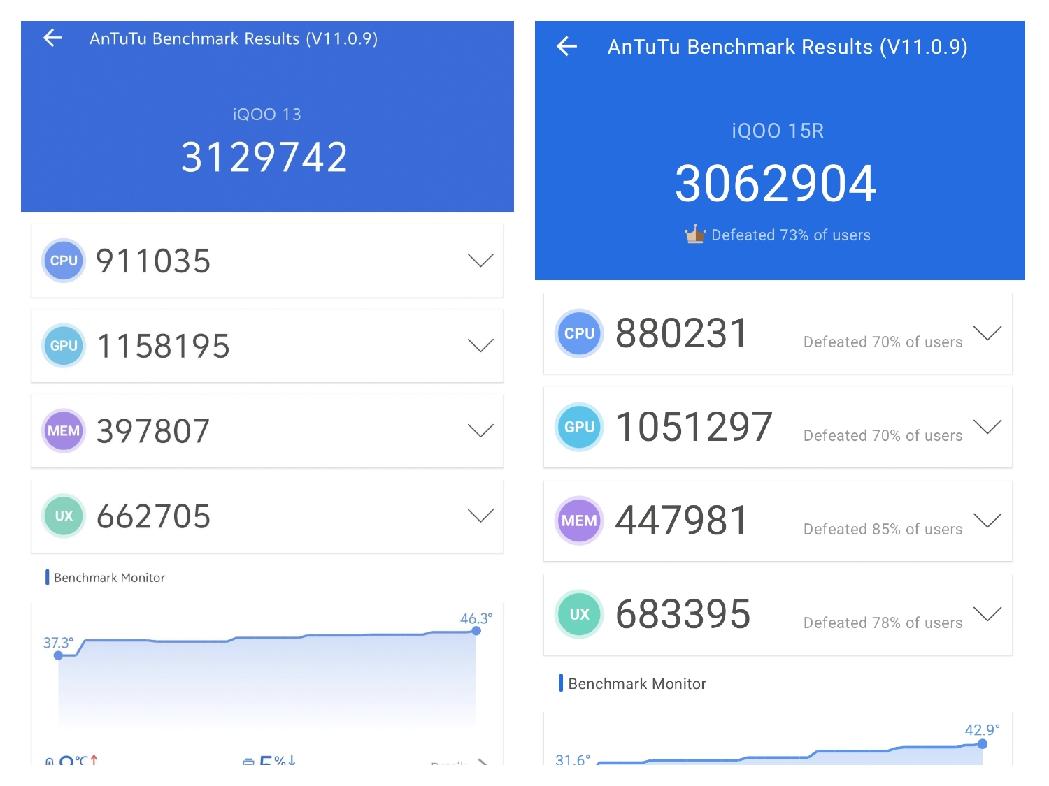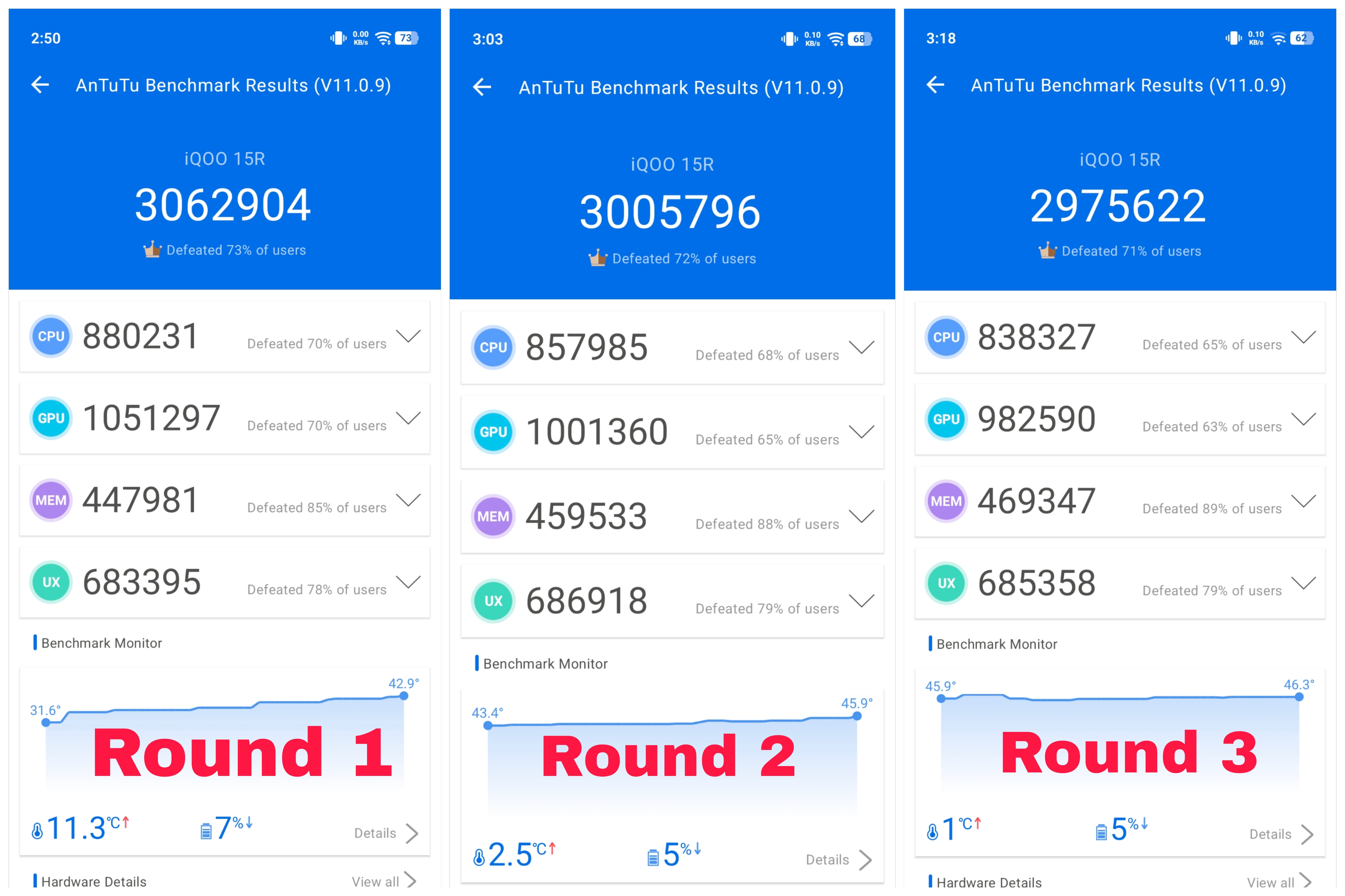 Throttling – unless the temperature crosses 46C or 47°C the iQOO 15R tries hard to push as much power as possible which is the mark of a true gaming Flagship. Although 15R is a compact device it will always be at a slight disadvantage when it comes to heat dissipation compared to larger devices with the same chipset.