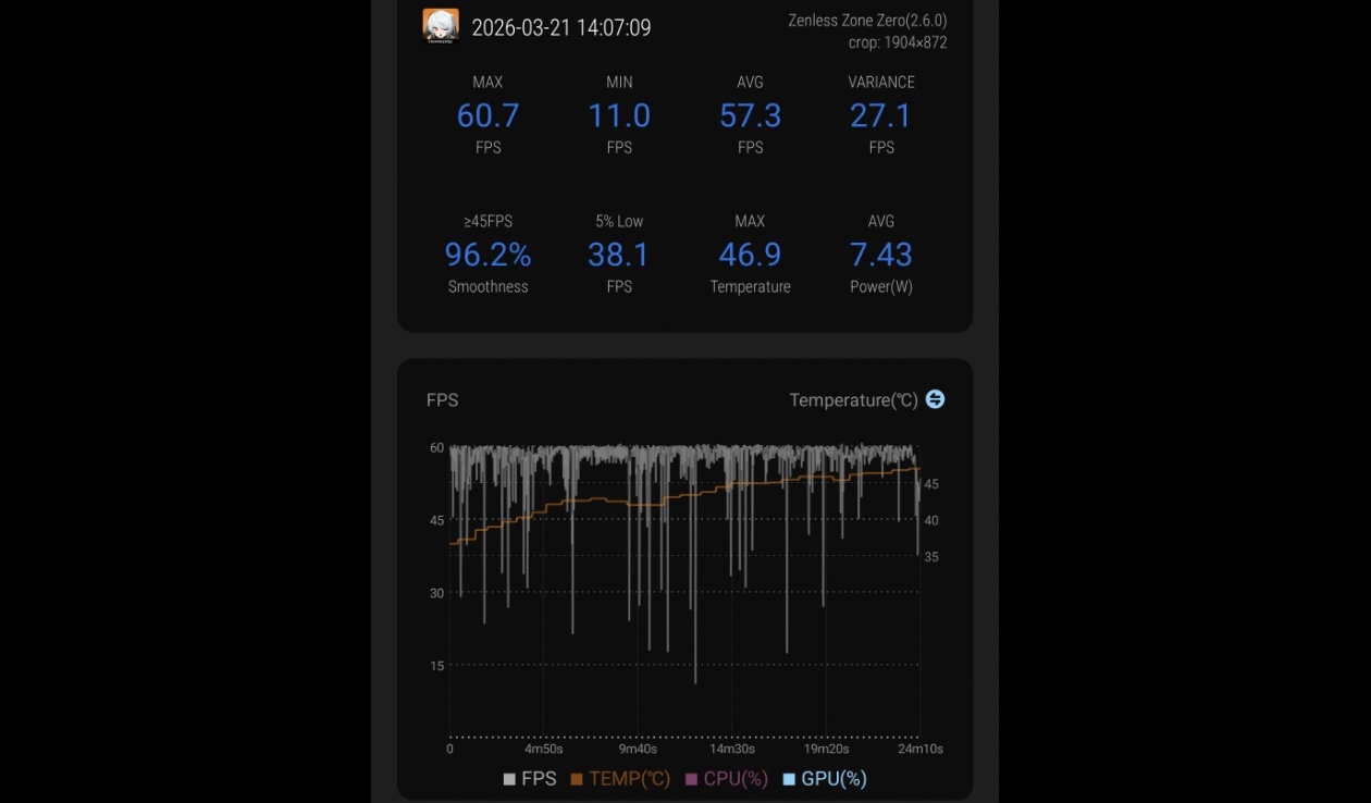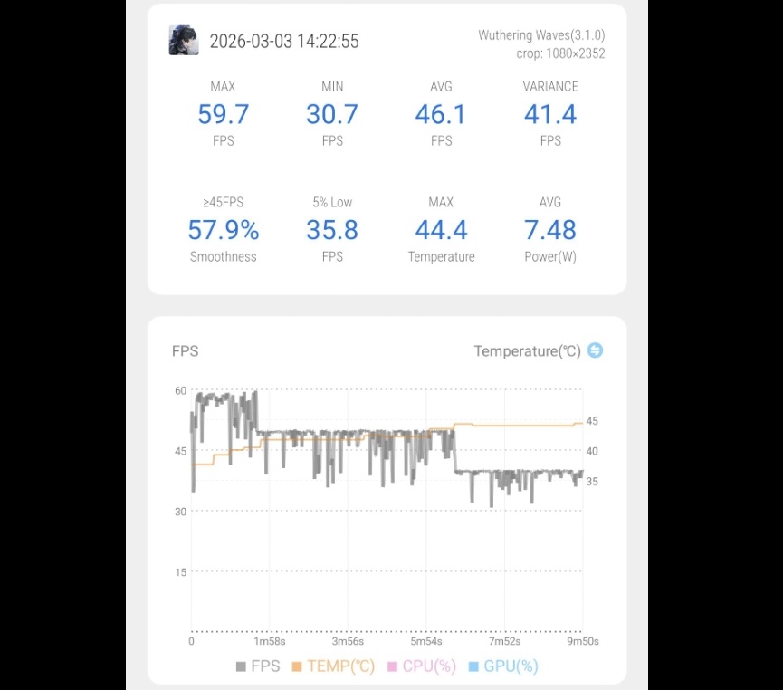 Wuthering waves is a GPU dependent game it's too much for 8 Gen 5 to handle at Max settings. Even pushing 10 watts of power draw Stable 60 fps is impossible and max temperature increases upto 46°C within 10 minutes. Average fps can drop as low as 30fps during combat or in the new Lahai Roi map.