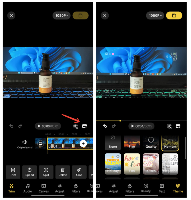 The Pro editing tools cover audio editing, trimming, filters, pre-built themes, and text overlays — all natively, without downloading a single third-party app.