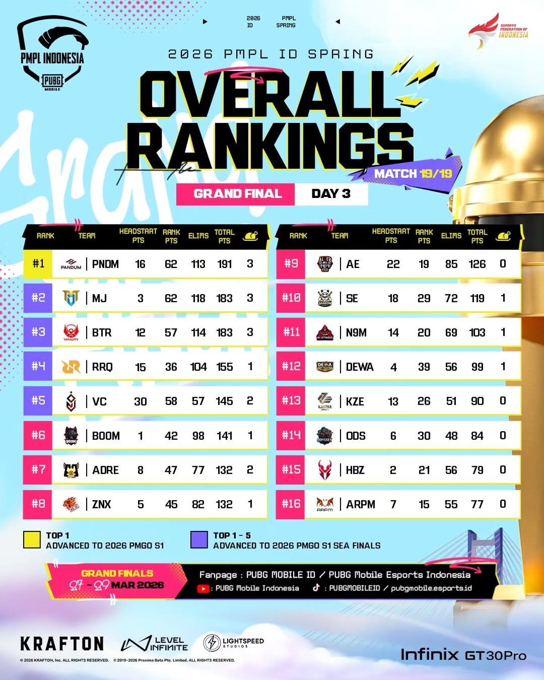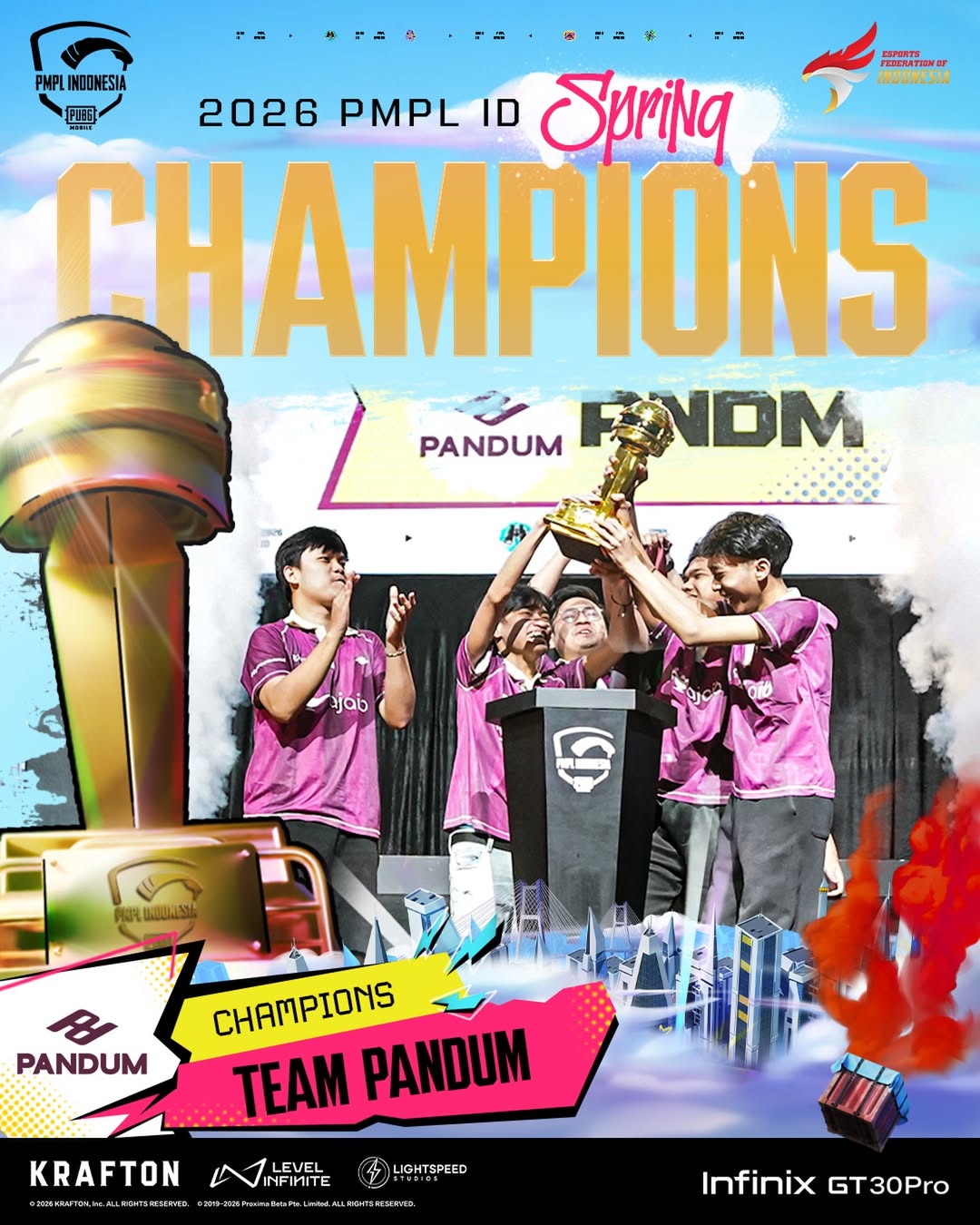 The Grand Finals of the PUBG Mobile Pro League (PMPL) Indonesia 2026 Spring came to an end on March 29. The 16 finalists played a total of 19 games across three days of the finale. Team Pandum emerged victorious in this event and secured a spot directly in the PUBG Mobile Global Open (PMGO) 2026 Season 1 Main Event, scheduled to be held in Indonesia in June.