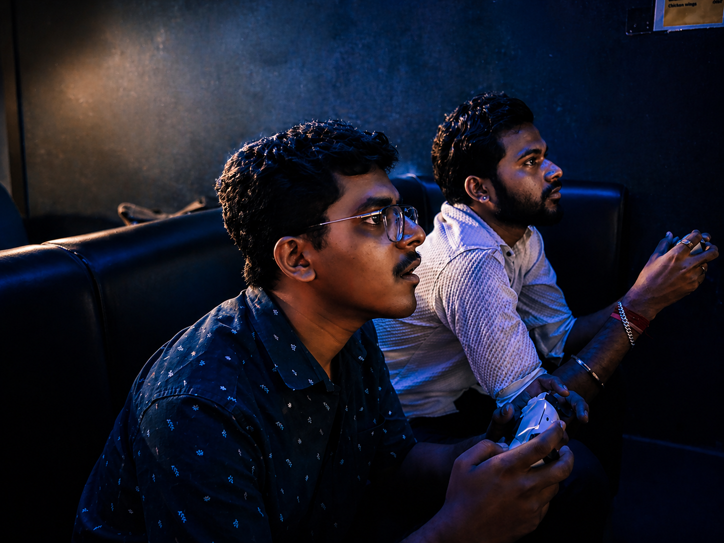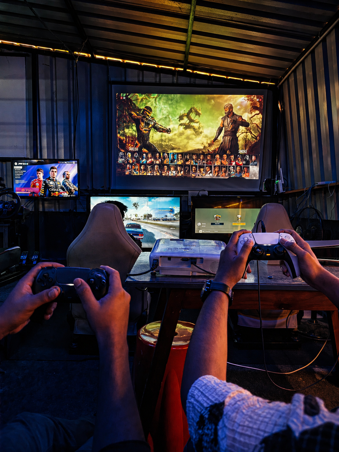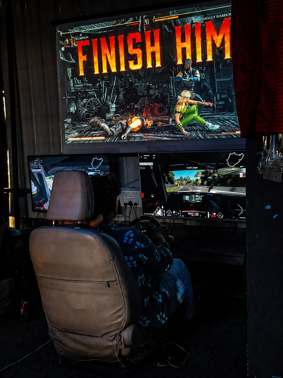 From the giant projector screen flashing "FINISH HIM" to the roar of the F1 engines on the sim-monitors, every corner was alive with action. The mix of cinematic lighting and the intense focus of the Questers created an electric atmosphere that you could feel the moment you walked in.