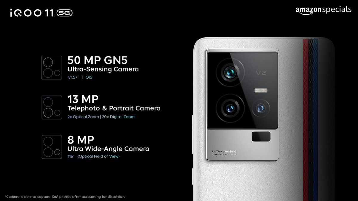 The telephoto camera uses the Samsung 3L6 sensor (13MP, 1/3", 1.12µm) placed behind a 50mm-equivalent lens with an f/2.46 aperture. iQOO calls it a Telephoto & Portrait camera.