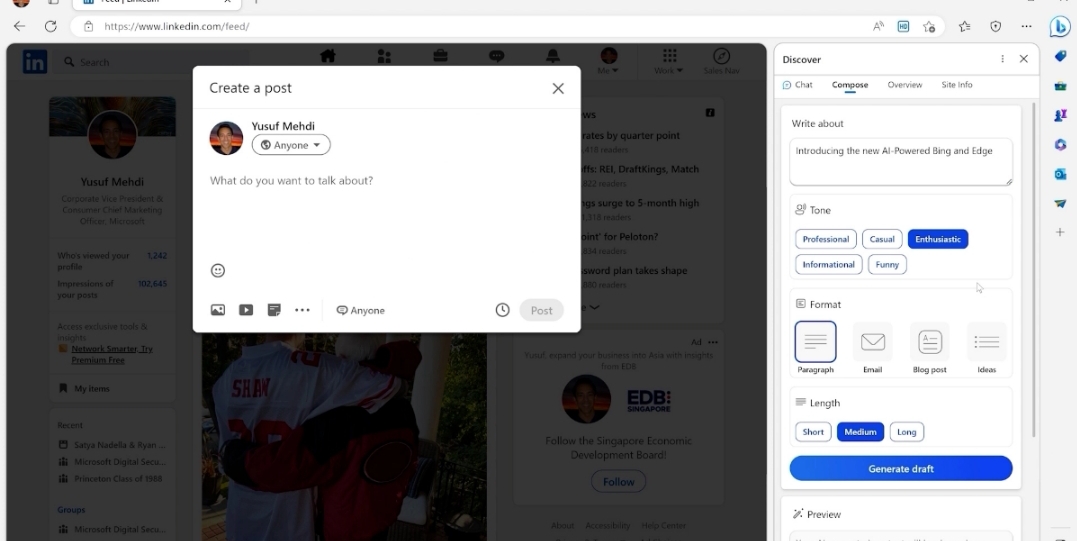 Microsoft has introduced a new and improved Bing search engine and Edge browser that utilizes AI and is designed to enhance the search experience by delivering more complete and accurate answers, a new chat experience, and the ability to generate content. This new AI-powered Bing and Edge browser is currently available for preview