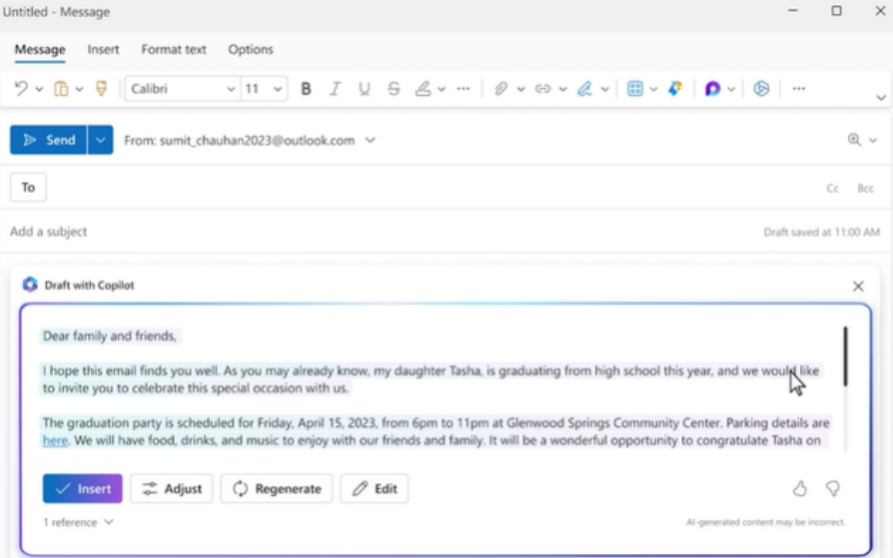 Respond to an existing email with a simple prompt or turn quick notes into crisp, professional messages—pulling from other emails or content that you already have access to from across Microsoft 365. Use toggles to adjust the tone or length of your note.