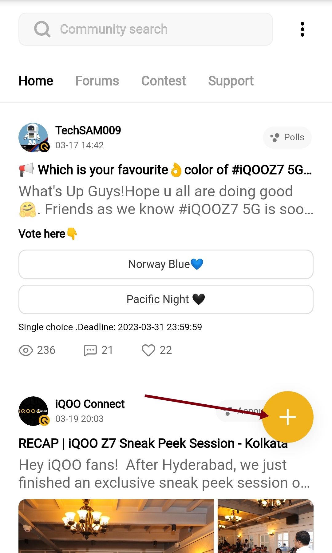 Open iQOO Community Home Page and then click on the '+' sign on the right side as shown below.