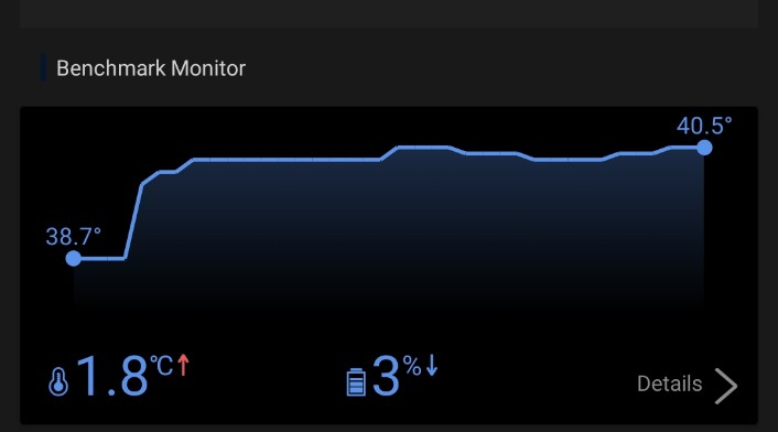 Throughout the test, I did not see any heating issues, brightness drop, or lagging. the test went very smoothly. After the test, I observed only a 3% fall in the battery from 73% to 70%. and 1.8 degree Celsius temperature rise in CPU. throughout the test, the stability and temperature of the device were maintained very efficiently. Here is the snapshot for the same.