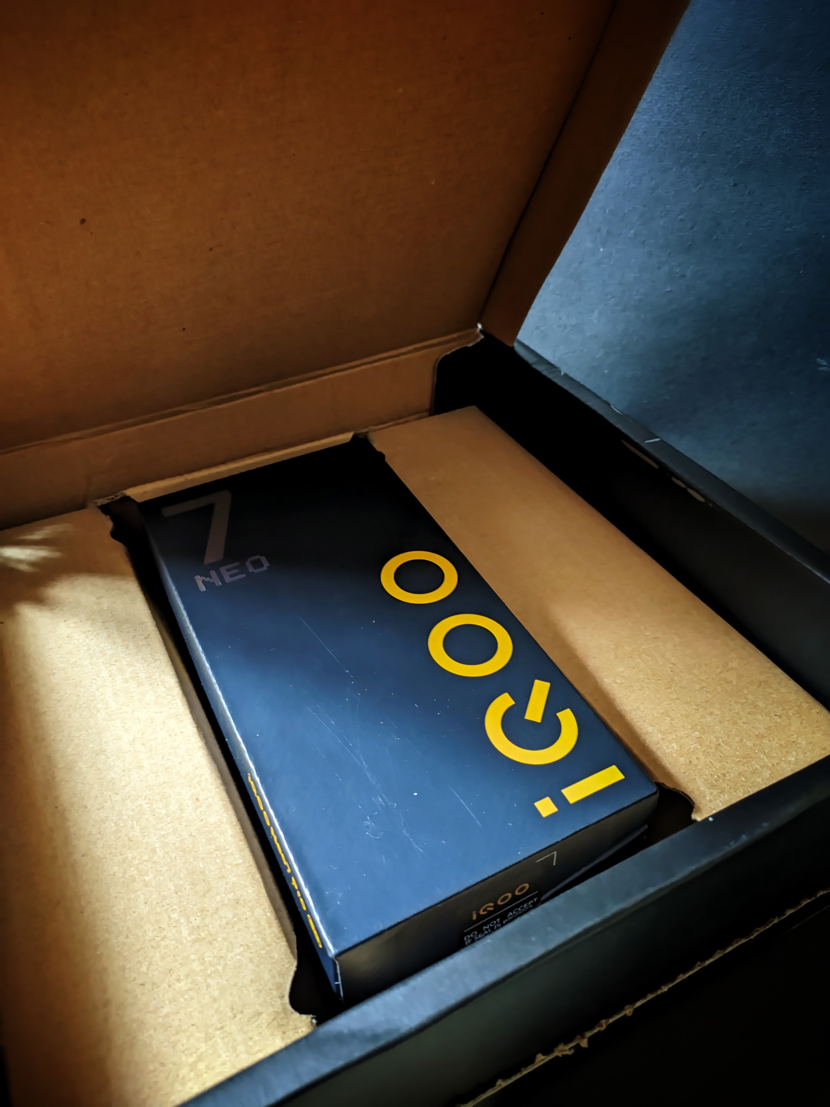 I received the package a bit late because of some unseen weather issues and some with the courier service. The iQOO Neo7 Pro was placed securely in two boxes, with an outer box with the label iQOO and an inner box with a diagonally styled, premium box showing the quality of the product.