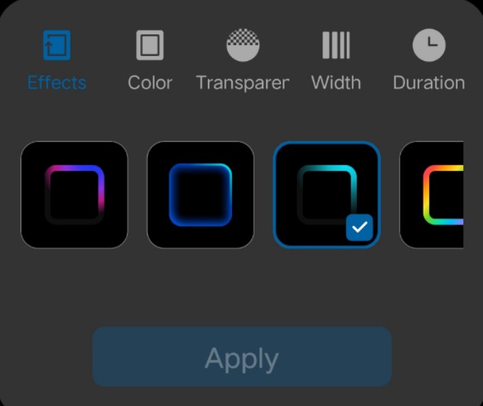 In this section you can select different light effect, their colour,width,transparer and duration.