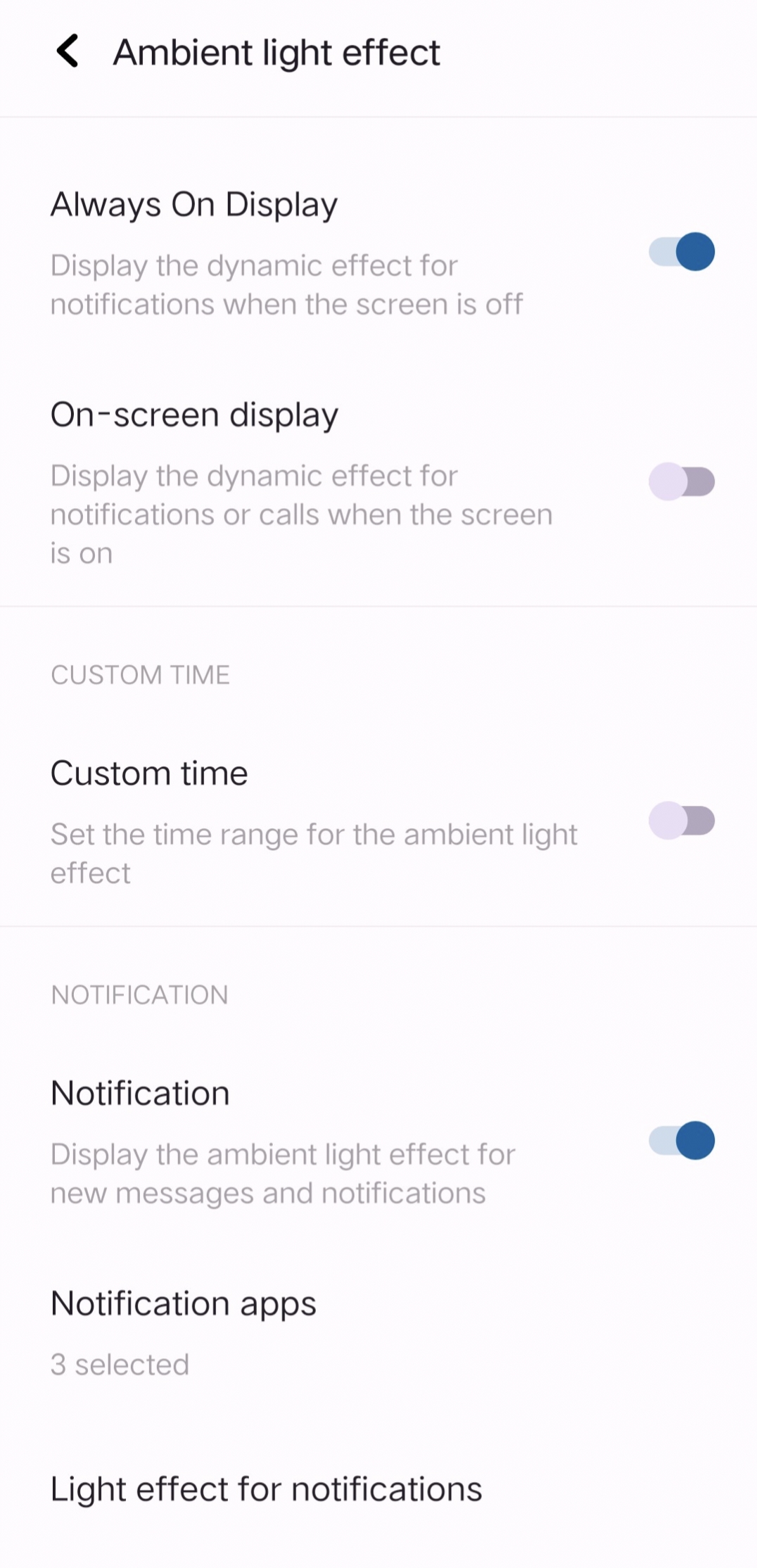 Here you can ON/OFF the ambient light effect for new msg and notifications.