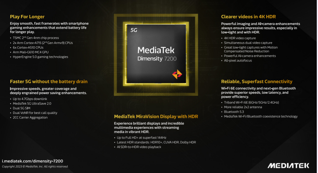 Launched in Q1 23', Mediatek 7200 is a Powerful chipset for mid range smartphones. Based on 4nm process this chipset is to amplify Gaming and Photography Smartphone Experiences.This Dimensity 7200 boasts cutting-edge AI imaging features, powerful gaming optimizations, and impressive 5G speeds, all with deeply engrained power savings for extended battery life.