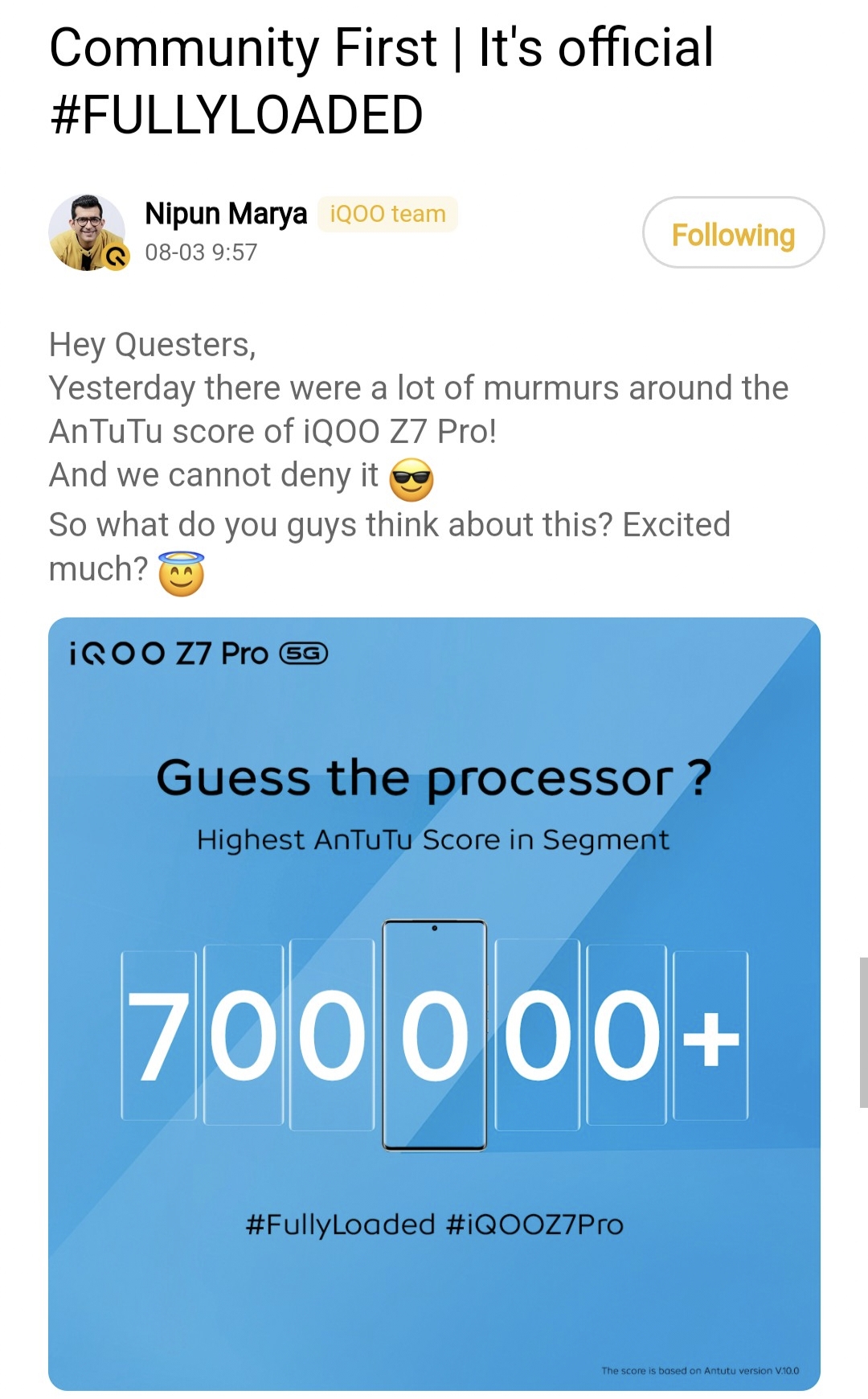 iQOO has been teasing an impressive Antutu score for the upcoming Z7 Pro, and it's no small feat. Antutu is a popular benchmarking tool that measures a smartphone's performance across various tasks. A high Antutu score indicates that the iQOO Z7 Pro is poised to deliver top-notch performance for multitasking, gaming, and more.