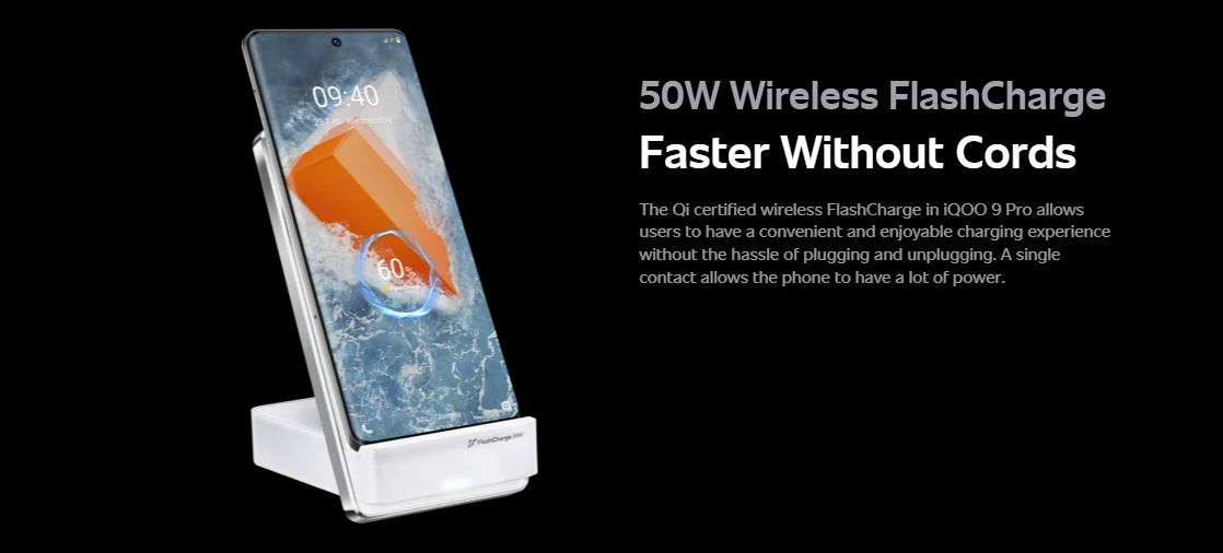 iQOO9 Pro supports up to 50W wireless charging and The phone also supports wireless reverse charging: hold another device close to the back of the phone and start reverse charging (up to 10W).