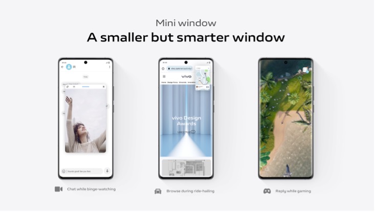 2.Enhanced Multitasking Features: Funtouch OS 14 takes multitasking to the next level, introducing an upgraded small window feature. Thanks to the improved visibility of adjustment lines, users will now find it easier to navigate and understand the adjustment range. Users can keep up to 12 small windows active in the background, and the OS offers support for side-swipe suspension, giving users more control. For scenarios such as ride-hailing, watching a video, and chatting at the same time, when users want to focus on one app but still monitor another, a new non-interactive mini small window mode is introduced. Users can easily switch between the small window modes with a single tap.