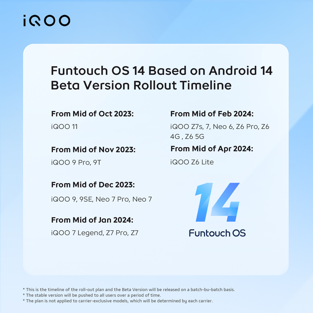 The schedule for releasing #FuntouchOS14, which is based on #Android14, has been finalised. Improve the stability and smoothness of your #iQOO smartphone experience by adding a layer of personalization and safety.