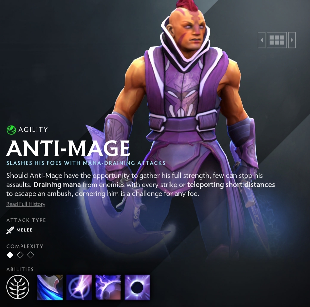 Anti-Mage is a popular agility carry hero in Dota 2 known for his exceptional mobility and ability to counter spellcasters. Here's some key information about Anti-Mage: