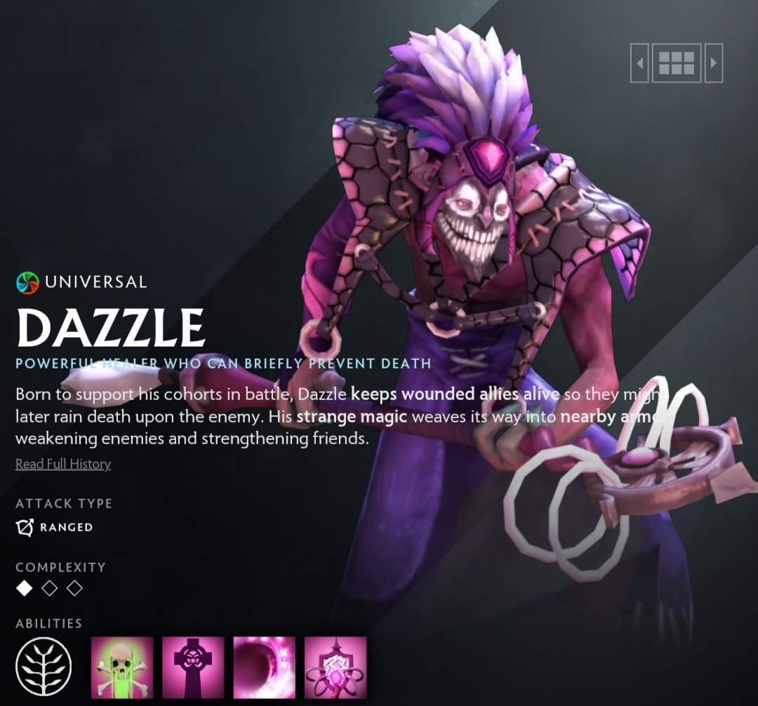 Dazzle excels at protecting and sustaining his team. He is commonly picked to counter physical damage-heavy lineups due to his armor manipulation abilities. His Shallow Grave is a game-changing ability that can save critical allies from certain death. He can also harass enemies in the early game with Poison Touch.