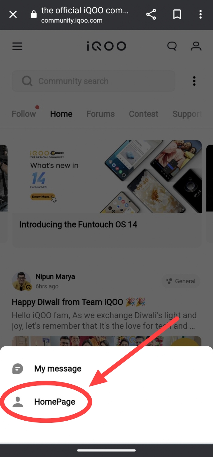 After entering the verification code, Congrats you have successfully created the iQOO Community account 🤘. Now again go to the three dots in the Top right corner and click that three dots. And in the bottom pop up click on HomePage Option to see your Profile details.