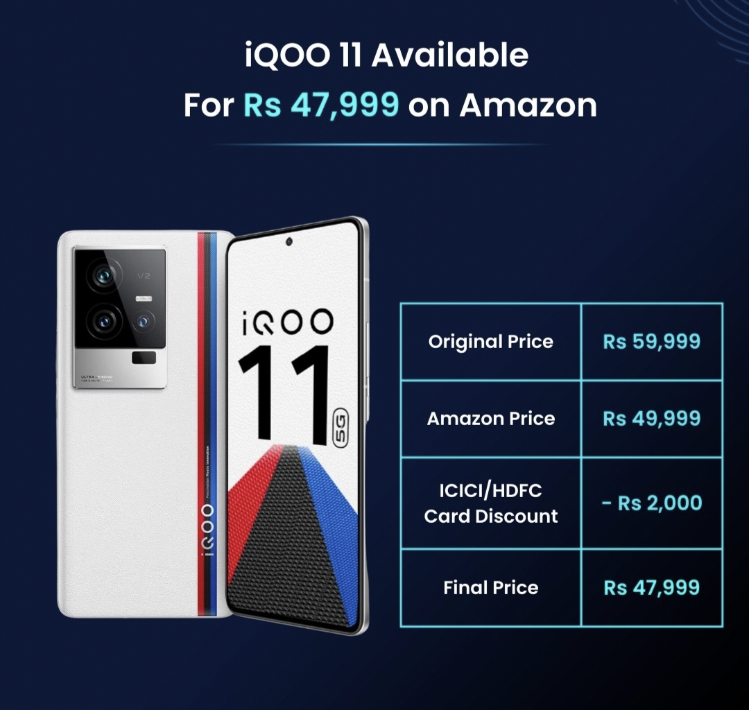 As part of the iQoo sale week, the iQoo 11 5G smartphone is available at Rs 51,999 on Amazon India. On top of that, you can get a flat Rs 2,000 discount if you purchase the smartphone using an ICICI or HDFC credit card. Which brings the price of the smartphone down to Rs 49,999.