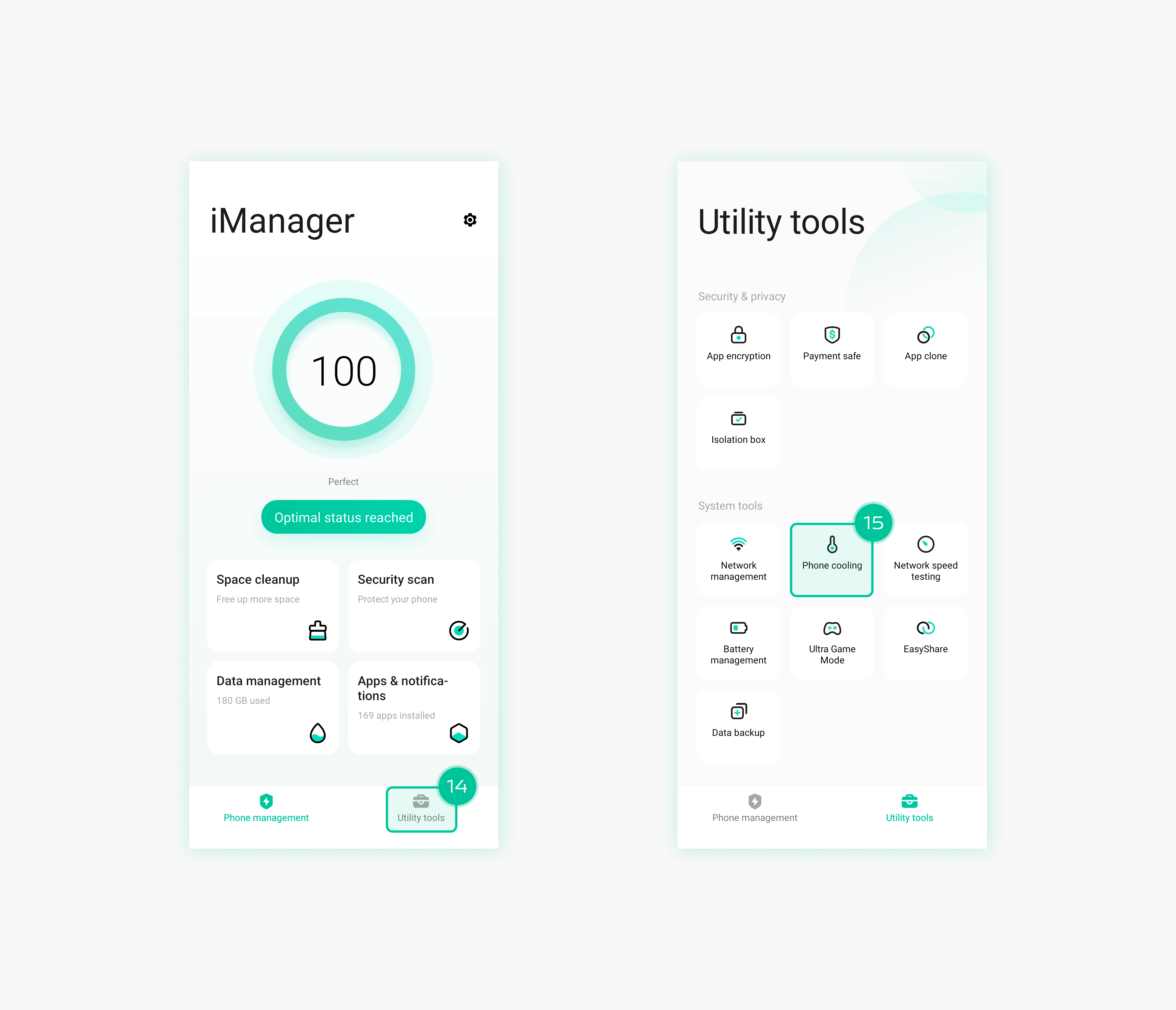 14/15. Photo cooling: When you navigate to the Utility Tools tab, you will find the Phone Cooling option. This feature closes background apps and neutralizes abnormal CPU usage, effectively reducing your phone's temperature.