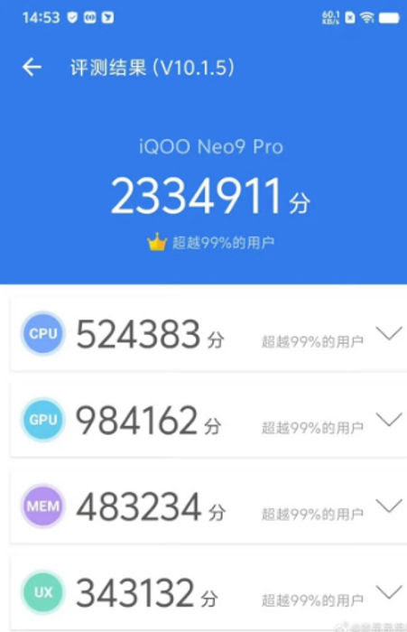 📱 The AnTuTu benchmark platform confirms the moniker of the iQOO Neo 9 Pro.