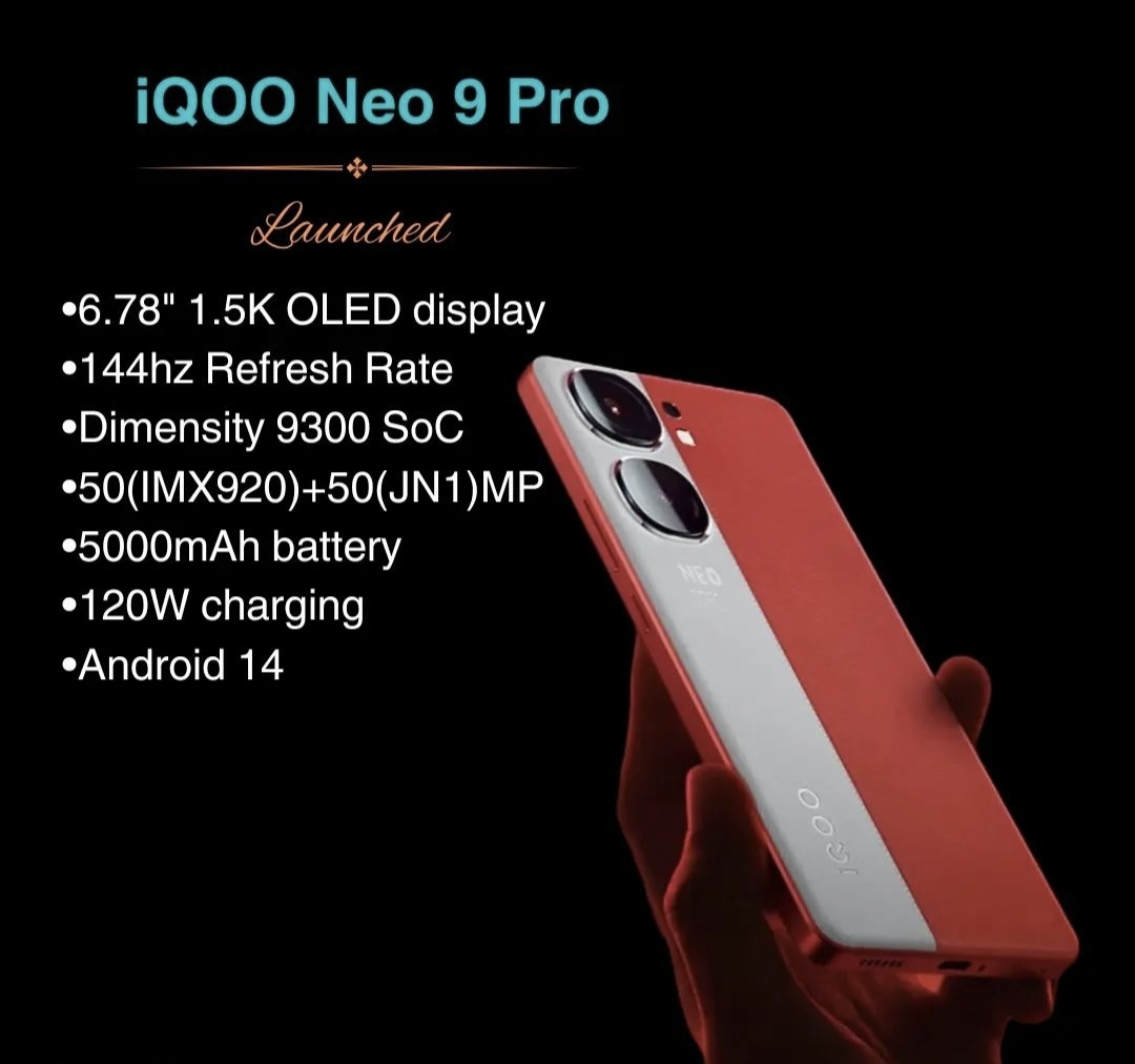 📱Cameras: The iQOO Neo 9 lineup is expected to pack a 50MP SonyIMX920 primary shooter with Optical Image Stabilisation (OIS) and a 50MP ultrawide snapper. There could be a 16MP shooter on the front for selfies.