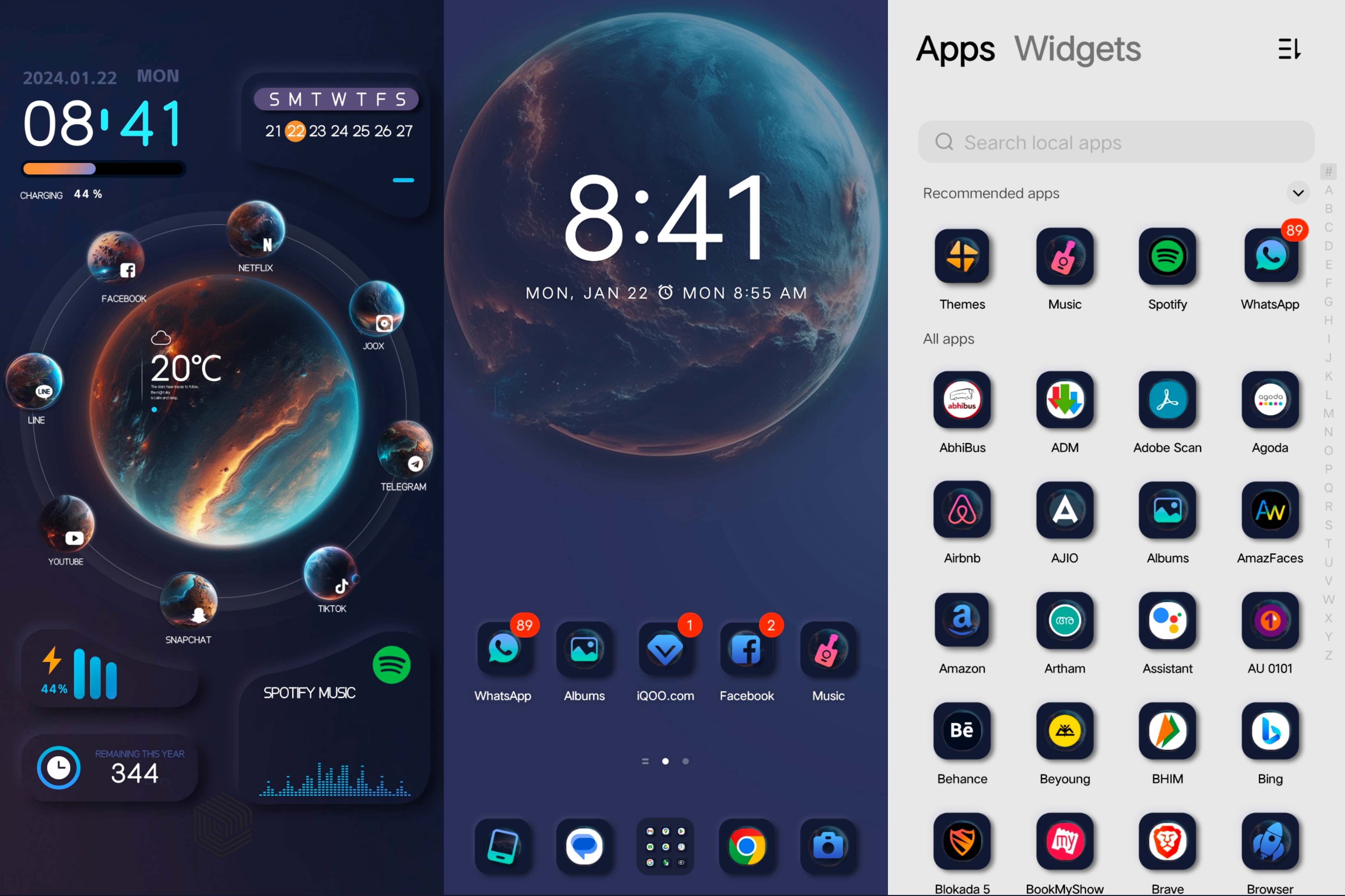 This captivating theme captures the mystique of the night sky, featuring the Milky Way in all its cosmic glory. A customizable lock screen features a lot of components and widgets, including app shortcuts, weather, and a music player.
