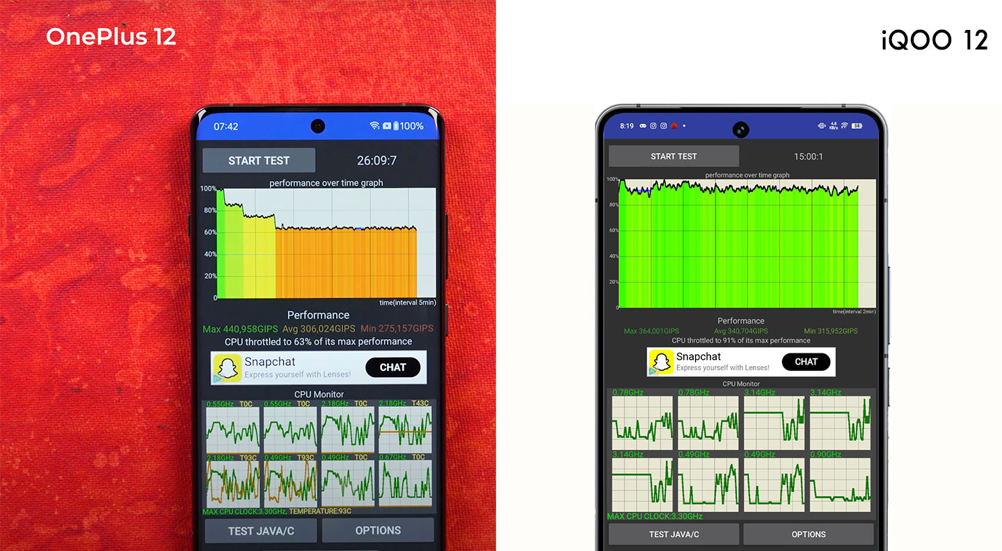 Let's check stability now. OnePlus has achieved 63% stability, whereas iQOO got 91% CPU stability in the ultimate throttling test.