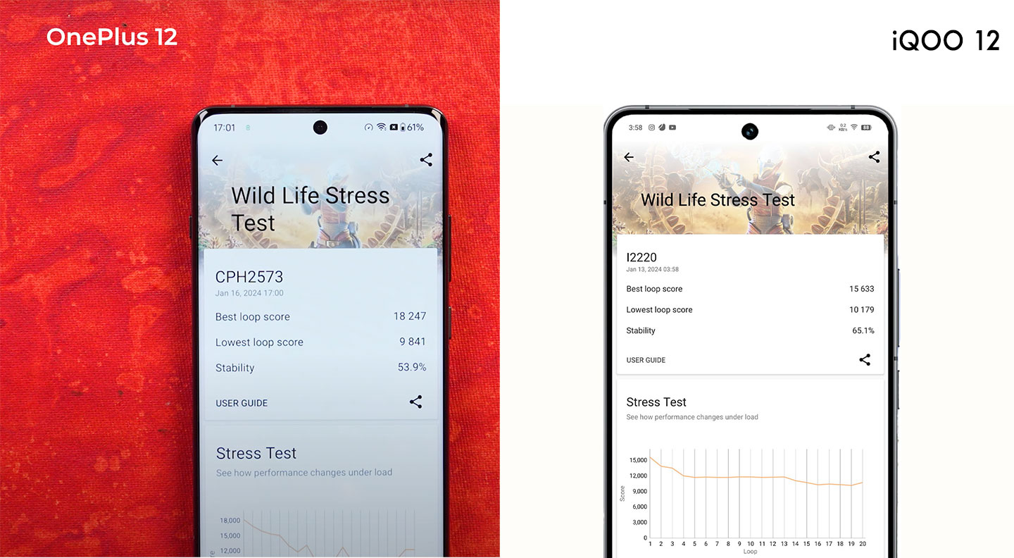 In the Wild Life Stress Test, Oneplus got 53.9% Stability score, whereas iQOO 12 got a stability score of 65.1%
