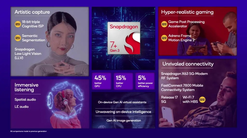 At the heart of the Snapdragon 7+ Gen 3 lies a revolutionary focus on artificial intelligence. Equipped with on-device generative AI capabilities, this chipset marks a significant leap forward in processing power and efficiency. Leveraging the prowess of large language models (LLMs) and large vision models (LVMs), such as Baichuan-7B, Llama 2, Gemini Nano, and Zhipu ChatGLM, the Snapdragon 7+ Gen 3 empowers users to interact with their devices in unprecedented ways. From enhanced virtual assistants to seamless multi-language translation and transcription, the possibilities are limitless, promising a transformative user experience.
