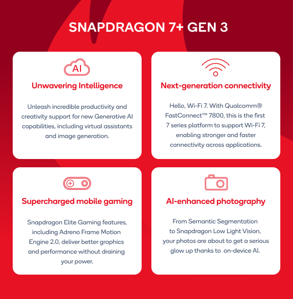 Snapdragon 8s Gen 3 takes specially curated features from your favorite Snapdragon 8 Series flagships and combines them into one personalized, premium experience that's more attainable than ever. You can expect the support for incredible Generative AI capabilities, industry-leading camera features, and breakneck 5G and Wi-Fi 7 connectivity that you’ve come to know and love from Snapdragon.
