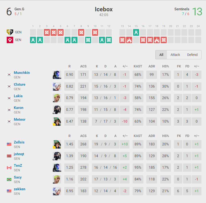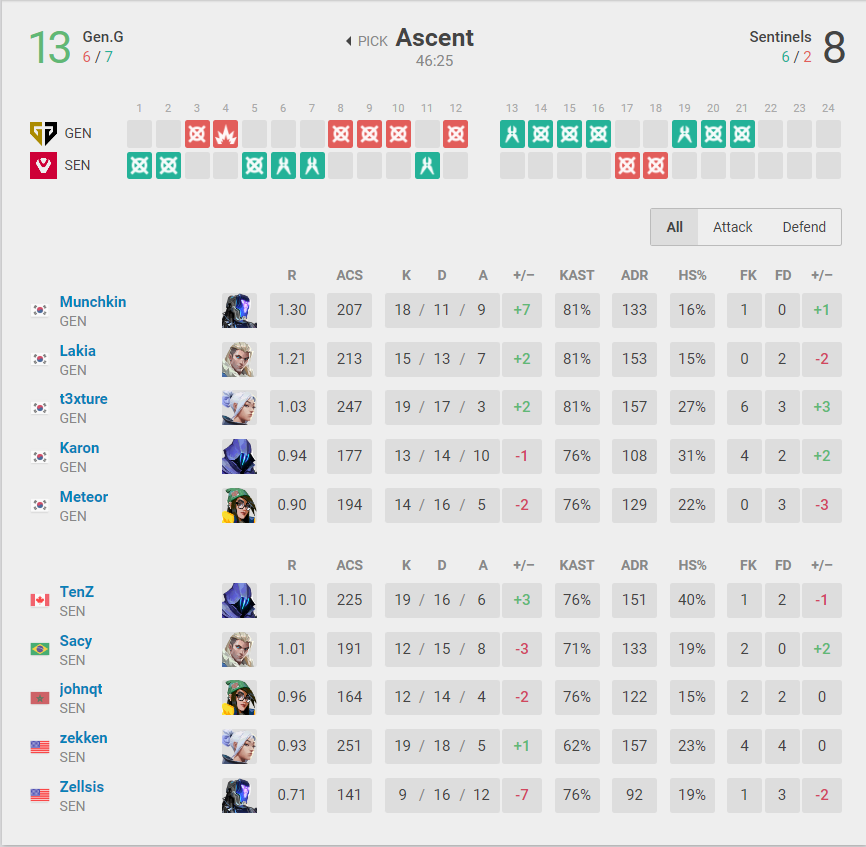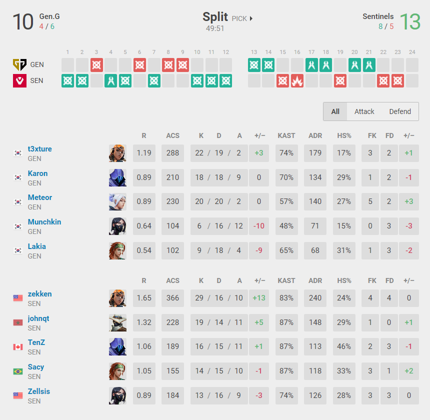 Map three was Ascent and Gen.G returned to winning ways with another 13-8 win to put them on match point, but Sentinels again fought back on Split to win 13-10 and set up an all important final map to decide the champion.