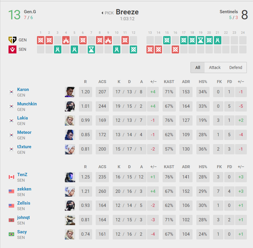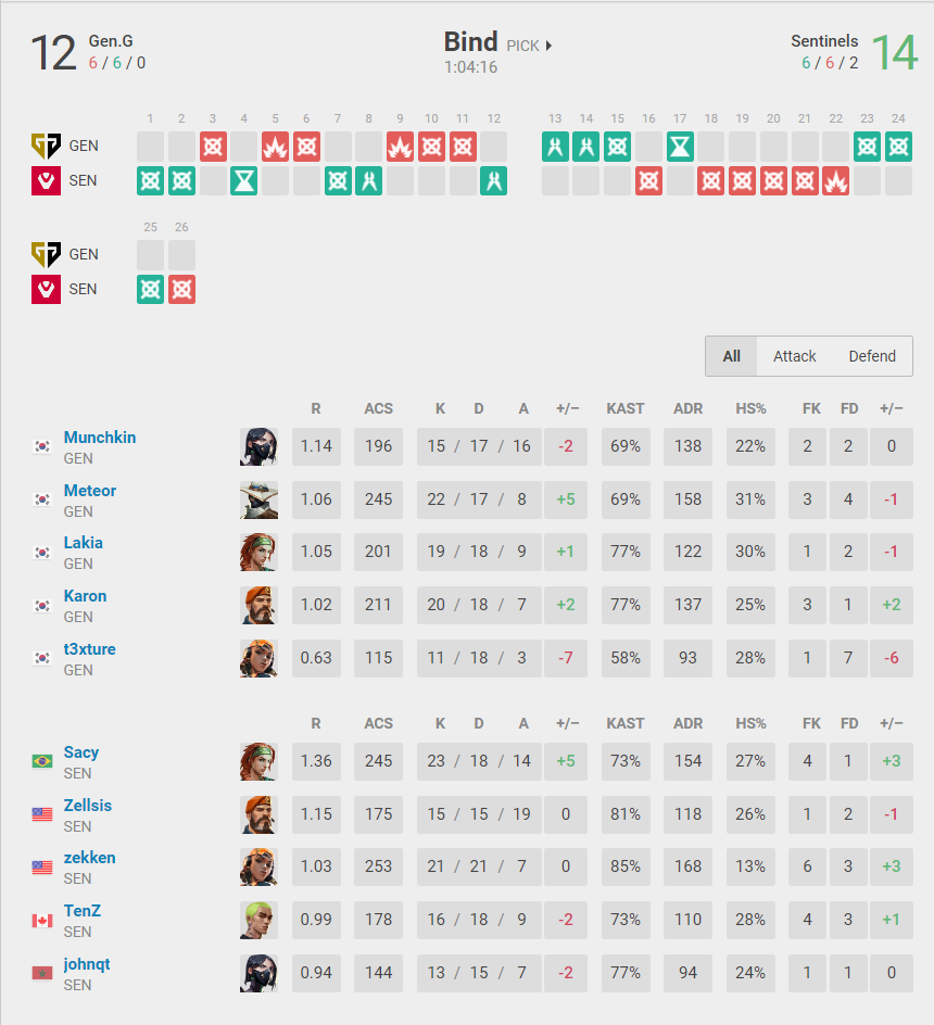 The final was a battle of the two teams that were without a doubt the best two in the competition, as both were only really challenged by the other. It kicked off with a fairly dominant 13-8 win from Gen.G on Breeze, before Sentinels woke up a little and took Bind 14-12 after going to overtime to even the series up at 1-1.