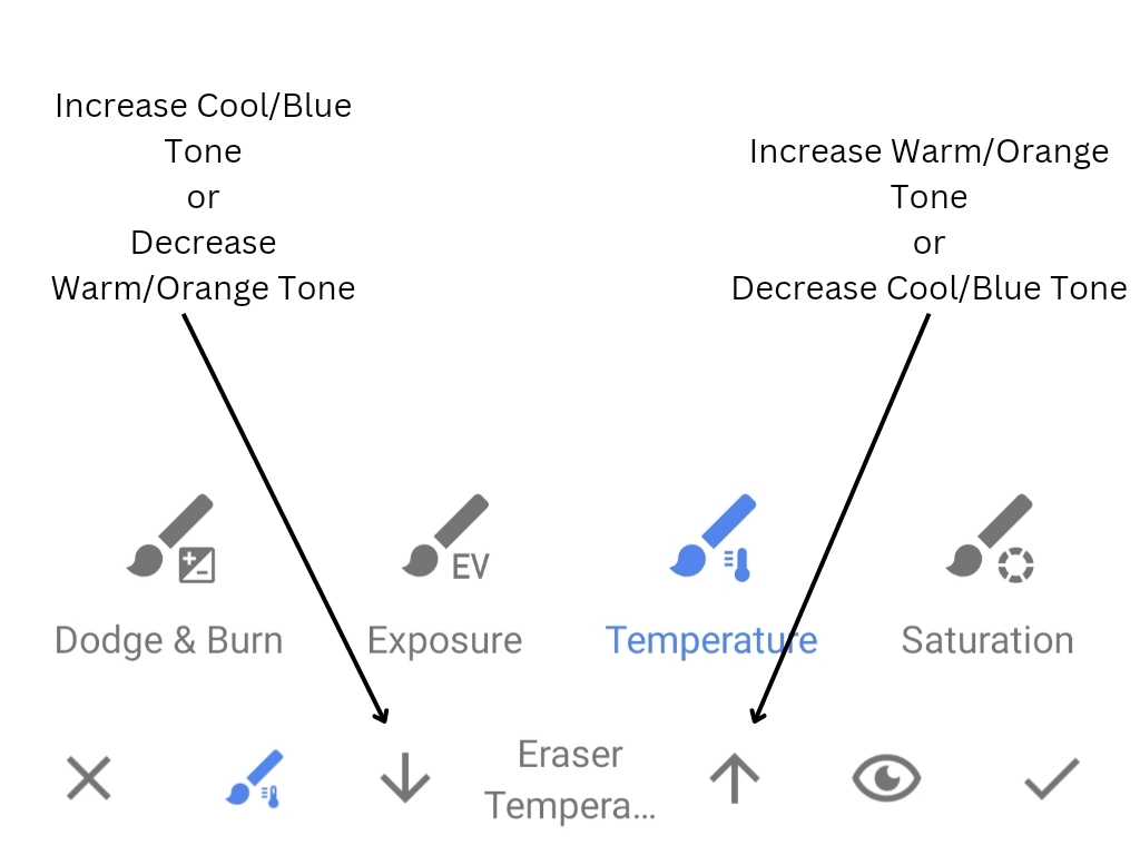 To change the temperature of certain regions in your image, use the brush tool. This might help you fix issues with white balance or adjust the temperature in your image to make it feel warmer or colder.