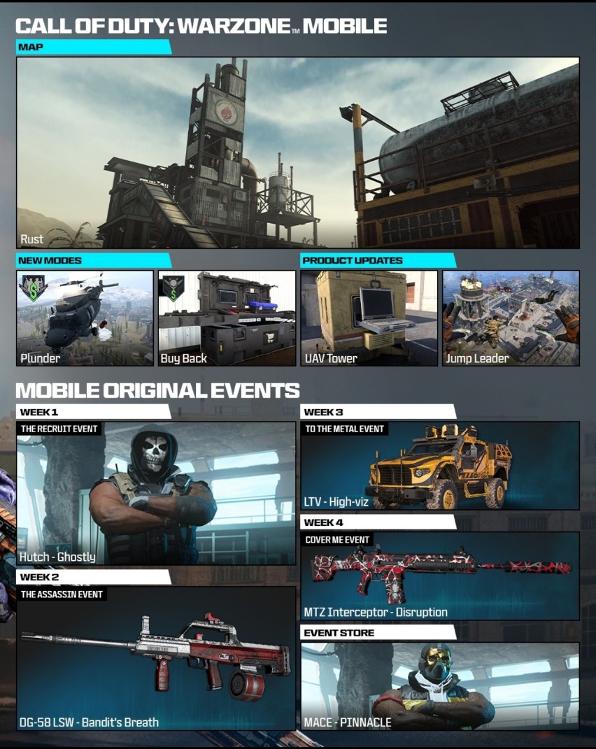 Rust Arrives, Plunder Drops: The fan-favorite map Rust is added to the map pool, along with two new Battle Royale Modes — Plunder and Buy Back! Plus, UAV Towers are ready to reveal enemy locations across Rebirth Island.