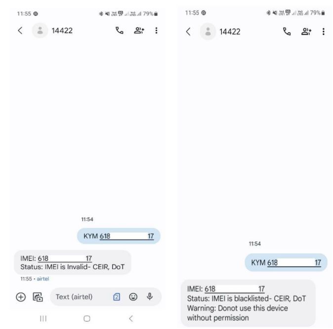 1. To know the status of a mobile device, the user has to send the text KYM <IMEI> to 14422. In its response, the application will send the status of the device.