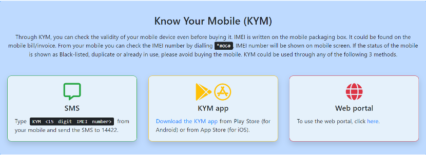 3. Go to the URL: www.ceir.gov.in. Scroll down a bit, and it will show the section: KYM